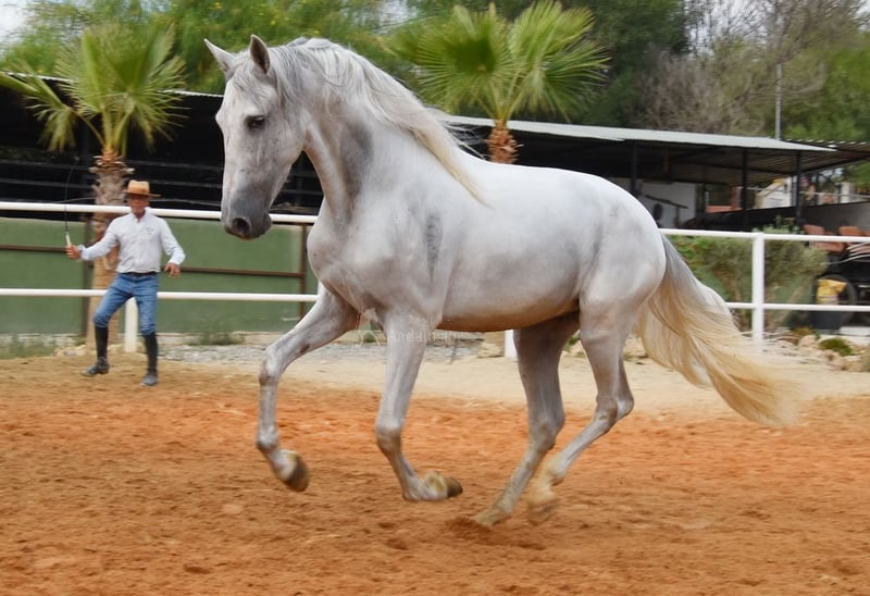 Carácter amable, montado en las fases básicas, buena ascendencia. Pedigree: Yeguada Triana Villarrubia, Yeguada Ferrero. Tiene varios antepasados calificados. www.elegante-andalusier.com