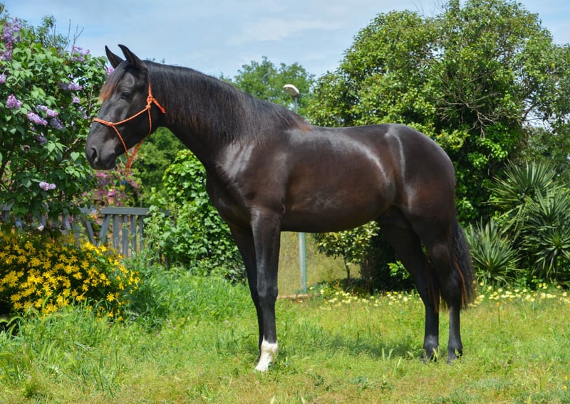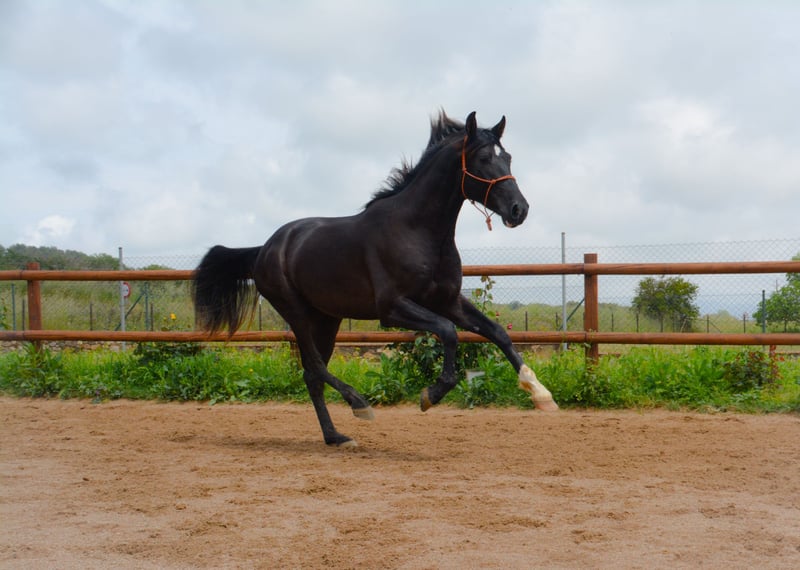 CORREFOC puledro PRE nero di 3 anni, 165 cm di altezza, appena rientrato dal campo, con ottimi movimenti e morfologia, sta iniziando il suo addestramento e a essere montato.