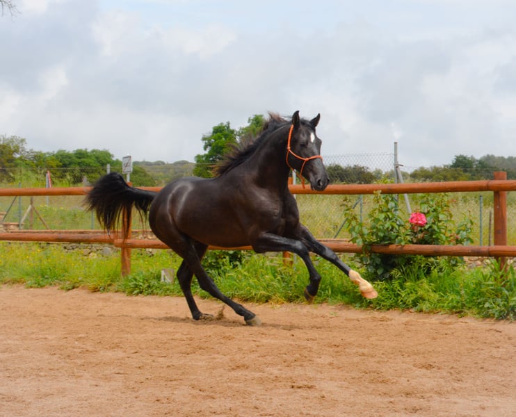 CORREFOC black PRE colt, 3 years old, 165 cm tall, recently entered from the field with very good movements and conformation, starting his breaking-in process and beginning to be ridden.
