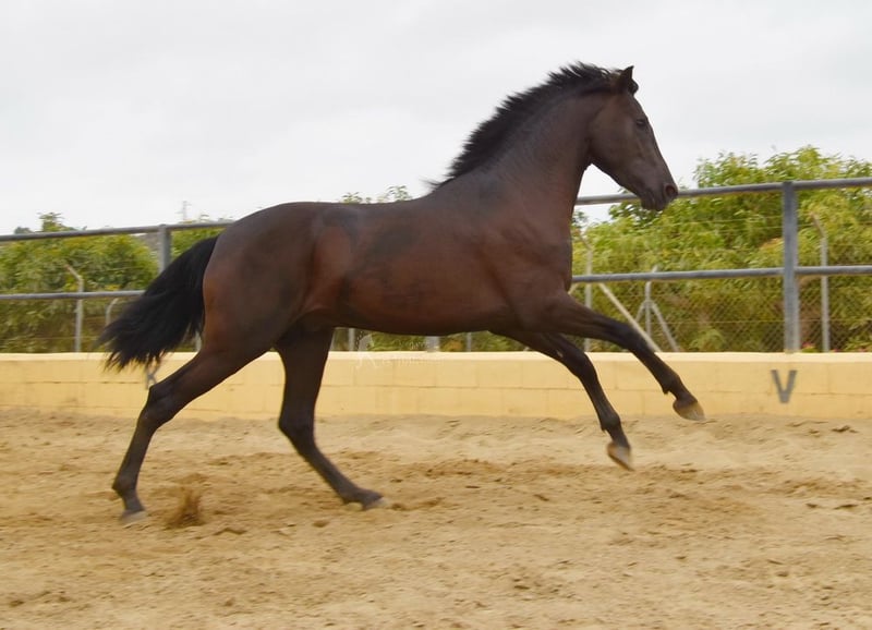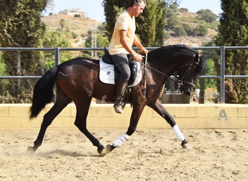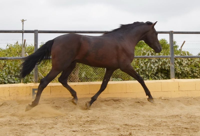 rustig karakter met een aangenaam temperament, nieuwsgierig, bereden in de basisgangen en cross-country, goede bewegingen, zwart paard met PRL-gen, afstamming: Paco Marti, Hnas San Roman www.elegante-andalusier.com