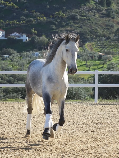 Callisto de CT, PRE gelding born 2021 and currently 166 cm. For sale direct from the breeder. Callisto is a horse with a bright future in the dressage arenas. He has exceptional movements and an amazing work ethic and energy. Callisto is from our own stud farm and has since he was born been a playful, curious and brave horse. He has a fun personality and it's impossible to not have a laugh when you're around him. In the riding he gives such a nice feeling in the saddle, he has a natural uphill tendency with good hind legs and he's incredibly soft to ride, both in the saddle and in the mouth. He has grown up in big paddocks with good terrain together with his best friend and always with a nutritious diet. Which can be seen on his correct and strong conformation. Located in southern Spain and we help with all the steps in the buying process. Read more about us at www.ct-equestrian.com and www.cthorsesales.com Contact: info@cthorsesales.com