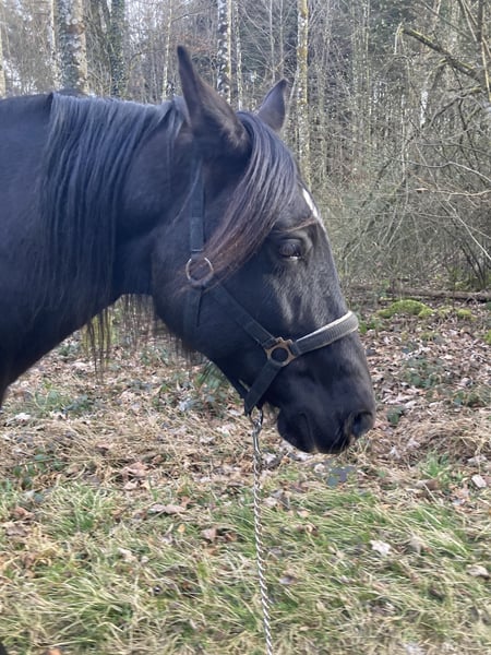 Il aime être au centre de l’attention et cherche donc une personne avec qui il ne doit pas partager son espace avec un autre animal. Il est prêt pour une formation d’adulte (presque) et travaille très motivé en manège. Il apprend avec curiosité et adore passer du temps en tête-à-tête, même lorsque les exercices deviennent un peu difficiles. Je suis moins motivé en carrière et je ne peux pas vraiment stimuler ses intérêts. En extérieur, il se laisse rapidement dépasser (chez mes élèves, je suspecterais un léger TDAH), mais il va fondamentalement partout avec vous. Après une demi-heure, cela lui suffit… nous autres, nous sommes alors encore en train de nous échauffer ;). Il se comporte plutôt comme un chef de meute dans le groupe, tant qu’on ne lui fait pas la leçon. Parfois, il confond cela avec du « leadership », mais ce n’est pas du tout son rôle. Les autres chevaux le laissent simplement faire ce qu’il fait, et tout le monde s’entend bien avec lui. Les personnes qui l’entourent doivent communiquer très clairement avec lui et instaurer des structures strictes. Il adore recevoir des caresses et est très câlin. Il aimerait probablement venir à la maison et dormir dans la même pièce que son humain. À l’adolescence, il joue avec tout ce qui lui tombe sous la patte et aime faire des bêtises – je ris très souvent. Il est né en septembre 2019 en Espagne, a grandi avec ses congénères dans une grande pâture, puis est arrivé en Suisse à l’âge de trois ans pour une formation de base. Lors du processus de vente, une modification du cartilage du canon a été détectée. Je l’ai depuis deux ans et demi, et je n’ai jamais rien remarqué lors de notre quotidien. Actuellement, je le remonte à nouveau, mais je préfère encore confier cela à son nouveau propriétaire.