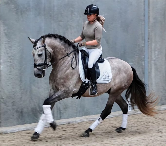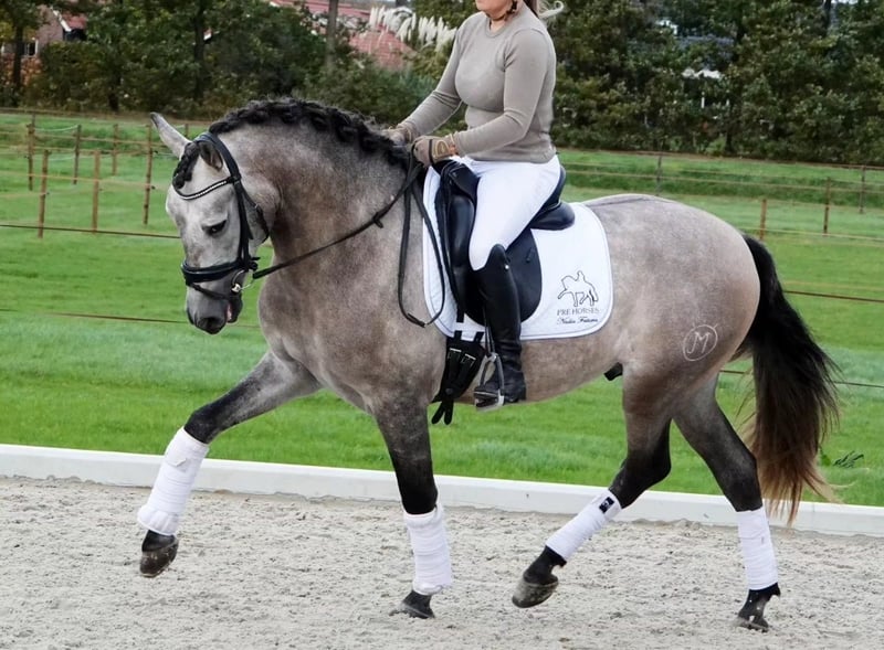 PRE mare DONJANA. At first a bit shy, this sweet girl now loves to be groomed and cuddled. This black pearl is super sweet, very sociable, and has excellent social behavior within the herd. But not only her beautiful baroque conformation and her wonderful color are strikingly beautiful. We were particularly impressed by this baroque beauty during her first ride. Although she was recently backed, DONJANA shows a pleasant diligence and incredible nerve strength under saddle. Additionally, her exceptionally comfortable movements make her a joy to ride. With her calmness and nerve strength, this wonderful mare is an ideal family and leisure horse. Whether in the arena or out on the trails, DONJANA is always with her rider and is not distracted by a lawnmower, barking dogs, or other external stimuli. DONJANA is not a mare that opens up to everyone immediately. But once she has given her heart to someone, this gem will be a loyal and reliable partner. X-rays are available.