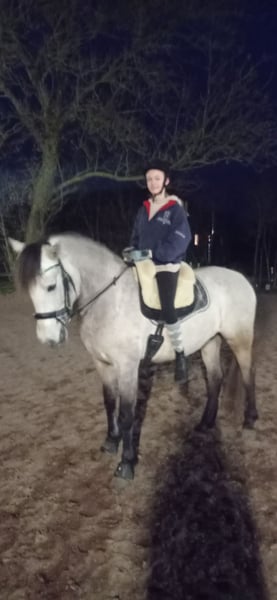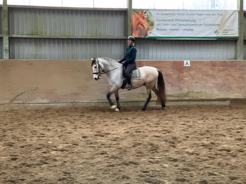 6 jähriger Wallach im besonders hellen Bayo Ton. Im Sommer cremefarbendes Fell, im Winter fast weiß. Geritten in den Basics (A- fertig/Anfänge L-Lektionen). Start in die Seitengänge und einfachen Gallopwechsel. Spanischer Schritt vom Sattel, wie auch vom Boden aus. Luft nach oben, jedoch fehlt die Zeit um es aktuell zu fördern. Er ist nicht ausschließlich für Anfänger oder schwache Reiter geeignet. Junge Mädchen mit Talent und Können sind kein Problem. Er bringt Charakter und tagesbedingt „Go“ mit. Er deckt große Reiter sehr gut ab, da er jetzt schon stark im barocken Stiel steht. Reiterin auf den Fotos 184cm Groß. Er selbst hat ein Stockmaß von 1,60m. Mit 1 Jahr wurde er aus Valencia importiert. Militärische und Cartujanische Linien im Stammbaum enthalten. Keine Allergien, keine OPs,…. Beherrscht zirzensik Elemente- Anfänge der Piaff, Kompliment, Seitengänge Trab,… Er lässt sich gut über Gewicht reiten. Er besitzt im Trab Campaneo, welches je nach Tempo mehr oder weniger ausgeprägt sichtbar ist. Jedoch macht es ihn auch „sitzbequemer“. Unter folgenden Link siehst du seine Abstammung. https://www.lgancce.com/lgpreancce/asp-publico/arbolGenealogicoPRE/ConsultarArbolGenealogicoPRE.aspx?ID=AxawRK0rW/U= Er steht auf dem Anhänger wie ein Profi, beim Verladen fehlt ihm manchmal die Routine. Er steht beim Tierarzt / Hufschmied brav und ruhig, war aber bisher immer Barhuf unterwegs. Er geht alleine ins Gelände, kennt Trecker, Autos, Hunde,… Pro Ritt erhebe ich eine Gebühr von 25€. Bei schlecht Wetter, bin ich auch gewillt, ihn zum Probereiten, in eine Halle zu fahren. Vieles an Equipment vorhanden, welches mit erworben werden kann, aber nicht muss. Wir könnten ihn auch in sein neues Zuhause fahren, da wir einen eigenen Anhänger besitzen. Sein Halbbruder zeigt die guten Anlagen im barocken Reiten und in der Zucht im Gestüt Floggensee als Cremello. Der Vater „Epon de Vale“ war sehr gefragt und viel im Deckeinsatz in Spanien. Ganz klar, Platz vor Preis für das neue 7 Sterne Zuhause.