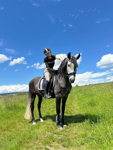 Wir suchen ein neues 5* Zuhause für unseren 8-jähriger PRE-Wallach. Macho ist im Umgang ein absoluter Schatz. Er liebt ausgiebiges Putzen und ist auch immer für eine Kuscheleinheit zu haben. Auch unter dem Sattel möchte er alles richtig machen und gefallen. Dennoch benötigt er einen sicheren und angstfreien Reiter. Er ist aber nie böse dabei. Er befindet sich aktuell auf A-Niveau und kennt Halle, Reitplatz, Führmaschine, Longierzirkel und Gelände. Stangenarbeit und Cavalettis/kleine Sprünge bereiten ihm ebenfalls viel Freude. Eine weitere Stärke liegt definitiv in der Handarbeit - Spanischer Schritt und auch Pi-Pa sind bei sicherer Bedienung abrufbar. Beim Koppelgang zeigt er sich anderen Pferden gegenüber stets freundlich und verträglich. Er ist außerdem Barhufer, steht in einer Paddockbox und wurde regelmäßig geimpft und entwurmt. Macho besitzt ANCCE-Papiere. Er wurde in Spanien geboren und in Deutschland schonend angeritten und weiter ausgebildet. Wir wünschen uns für Macho ein liebevolles Zuhause mit täglichem Koppel- und/oder Paddockgang. Alle weiteren Fragen beantworten wir gerne telefonisch. Video versenden wir gerne auf Anfrage.