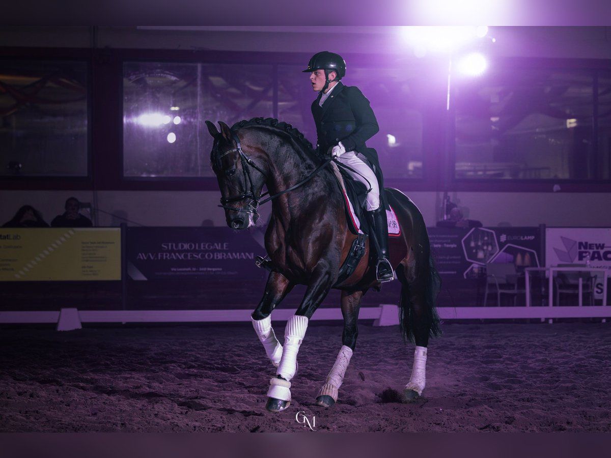 Azor MP PRE gelding with ANCCE registration? Born in 2018 (7 years old) 16.1 hh Well-trained Level M (lead changes, shoulder-in, lateral work, leg-yields and pirouettes, some series of flying changes, and starting piaffe) Is the horse registered with FISE? He has competed in E, F, and M categories, achieving good results, up to 65% in M. Currently in training and competing. 2nd place at the Iberian Master 2025, Evora Level (FISE competition record available on EquiResults) A highly reliable horse with an exceptional character, very cooperative and fun to ride, free of any vices both on the ground and under saddle. Smooth movements with a high-quality trot. Ridden with a snaffle bit and bridle. PRICE REDUCED due to a slight scar on the left front tendon; despite this, the horse is healthy and moves regularly at all three gaits. Mornico al Serio (BG) For more info: Nicolas +39 348 584 2676
