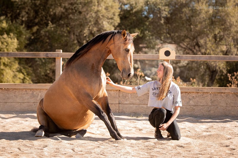 For personal reasons, I am looking to place my mare in new loving hands. Buena is a dream horse in a special color, who simply brings joy to work. She has extensive training in groundwork and liberty work, responds sensitively to body language, and is being trained with a mix of horsemanship and classical riding art. So far, she has been ridden completely bitless. Buena's favorite activities are liberty work, including many tricks. She is full of energy and loves to show what she can do. These include: - Spanish walk - Spanish salute - Rear up - Collected halt - Twist (turning around her own body) - Sit - Backing up towards you - Side leaps - Bow - Podium and horse seesaw Buena's new owner should also bring joy to groundwork and liberty work. Under saddle, she can perform the basics such as leg yielding, shoulder-in, and turns on the forehand and hindquarters. Parking assistance included. She also goes wonderfully and relaxed in the outdoors, but she is only used to going out in a group. Going out alone would need to be learned. Buena is only accustomed to herd living and will only be sold into a herd. She is very sociable, whether with other mares or geldings. I bought Buena unbacked at 3.5 years old. She has lived with me in Spain so far but has been in Germany for a few months. The reason I am offering this dream horse at such a low price is that Buena is currently recovering from an injury. Since I am moving and do not want to integrate Buena into a new herd for a short period, I am already looking for a new owner. Thus, it is a unique opportunity for a unique horse at a great price. Once Buena is fit again, her price will increase. In my opinion, she can recover just as well with her new owner. I know she will be fit again; she just needs some time. If you are interested, I look forward to hearing from you. I will, of course, provide detailed information about the injury. Melina