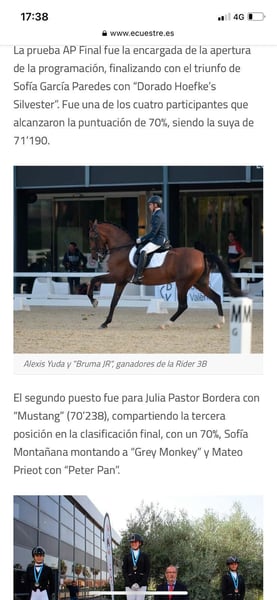 🌟 Rarität – Grand Prix-klassifizierte PRE-Stute mit außergewöhnlicher Qualität und Noblesse 🌟 Wir präsentieren eine ausdrucksstarke, 12-jährige PRE-Stute (169 cm) von außergewöhnlicher Klasse – eine wahre Ausnahmeerscheinung mit sportlichem Potenzial, feiner Rittigkeit und beeindruckender Präsenz auf höchstem Niveau. Eine Stute, wie man sie nur selten findet: exzellent gefördert, fein geritten und charakterlich ein Juwel. ✨ Sportliche Referenz der Spitzenklasse Diese Stute wurde offiziell bis Grand Prix vorgestellt – war unter anderem auch in Deutschland schon auf Turnier. Ihre Erfolgsbilanz spricht für sich: nahezu ausnahmslos platziert oder siegreich, souverän und zuverlässig im Viereck, stets konzentriert, leistungsbereit und durchlässig. Sie brilliert mit sicheren Lektionen wie Piaffe, Passage, Wechsel – jederzeit präzise und mühelos abrufbar. ✨ Exzellente Rittigkeit & Charakter Sie überzeugt durch ihre besondere Leichtrittigkeit und Feinheit, ist brav an der Trense zu reiten und zeigt sich auch im Gelände absolut unkompliziert – sogar von einer jungen Reiterin allein. Im täglichen Umgang ist sie nervenstark, freundlich und zuverlässig – verlädt problemlos, reist stressfrei und zeigt sich auch in neuer Umgebung sofort ausgeglichen. „Bruma“ – Ihr Name bedeutet „Nebel“, und ebenso fein, leicht und durchlässig ist sie zu reiten. Eine Erscheinung, die Eindruck hinterlässt – nicht laut, sondern tief bewegend. Aktuell befindet sich die Stute im professionellen Beritt und wird kontinuierlich auf hohem Niveau gefördert. Eine aktuelle Ankaufsuntersuchung inkl. Röntgenbildern liegt ohne Befund vor. Ihre elastischen, ausdrucksstarken Grundgangarten erinnern an ein modernes Warmblut, gepaart mit der typischen Ausstrahlung und inneren Stärke des Pura Raza Española. Diese PRE-Stute entstammt einer vorbildlichen Zuchtlinie: Vater MANCHEGO ARB, mehrfacher Spanischer Meister und SICAB‑Goldmedaillengewinner, sowie WM‑Teilnehmer, prägen ihren herausragenden Typ und Bewegungsablauf. Ihre Mutter VENUS XIIII rundet das Pedigree durch solide, auf Barocklinien basierende Verpaarung ab – eine Kombination, die in Bruma höchste Leistungsbereitschaft, Charme und Ausdruck verein Diese Stute ist nicht nur ein sportliches Talent – sie ist eine Partnerin fürs Leben, eine wahre Lebensversicherung für den ambitionierten, feinfühligen Reiter, der Qualität zu schätzen weiß. Aufgrund ihrer Feinheit und Leistungsbereitschaft wünschen wir uns für sie einen erfahrenen Reiter mit Einfühlungsvermögen. Sie wird aus privaten Zeitgründen in beste Hände abgegeben. Standort Nähe Frankfurt - Deutschland. Nur ernst gemeinte Anfragen – Preis entspricht der Qualität.