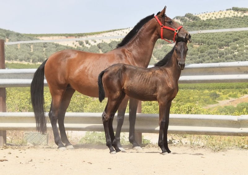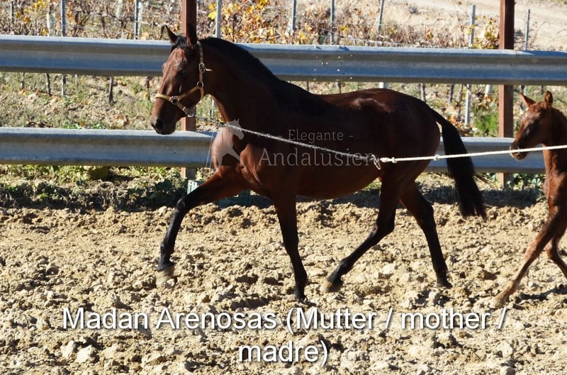 lieber Charakter, roh, steht mit ihrer Mutter und anderen Stuten und Fohlen draußen, groß, gute Bewegungen, spezielle Farbe, Rappe mit PRL-Gen, Abstammung: Juan Antonio Fernandez Vargas, Yeguada Arenosas, Yeguada Militar, Uropa Sentado ist qualifiziert