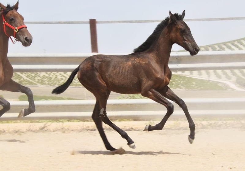 carácter amable, en estado bruto, está con su madre y otras yeguas y potros afuera, grande, buenos movimientos, color especial, negro con gen PRL, ascendencia: Juan Antonio Fernández Vargas, Yeguada Arenosas, Yeguada Militar, bisabuelo Sentado está calificado.