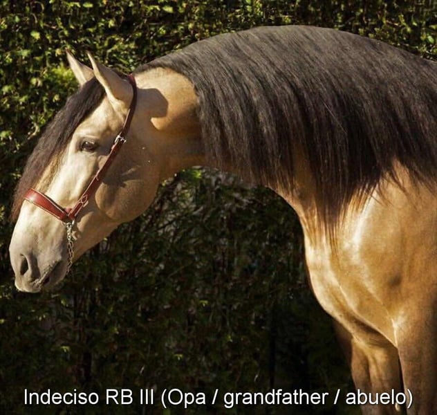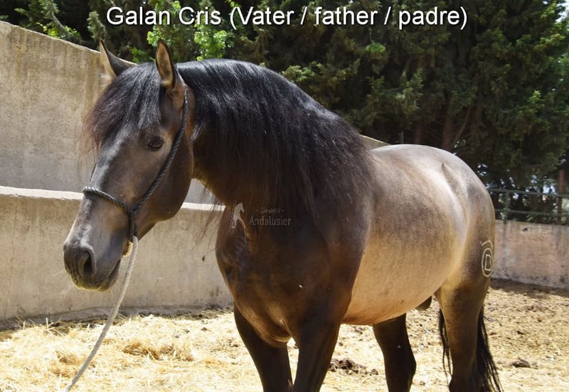 lovely character, curious, unbroken, kept outside with other mares, special color, PRE buckskin with papers, good movements and pedigree, lineage: Alfredo Gala, Pablo Perez Jimenez, Castillo Villafranca, Andres Holgado Dianes, great-grandfather Mariscal de Torre and great-great-grandfather Remache XIII are qualified www.elegante-andalusier.com