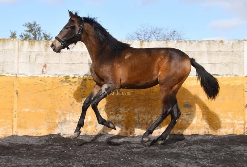 cher caractère, curieux, brut, est dehors avec d'autres juments, couleur spéciale, fauve PRE avec papiers, bonnes allures et origines, origines : Alfredo Gala, Pablo Perez Jimenez, Castillo Villafranca, Andres Holgado Dianes, Uropa Mariscal de Torre et Ururopa Remache XIII sont qualifiés www.elegante-andalusier.com