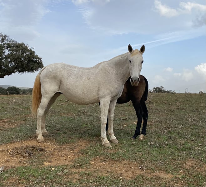 Preis ist bis April ‘26 reduziert, damit ich dem Pferd einen weiteren Umzug ersparen kann. Im Mai zieht sie auf meine Finca und der Preis steigt wieder an. Zum Verkauf steht diese wunderschöne PRE Stute, die auf den riesigen Weiden der Yeguada Yedra in der Gegend von Malaga aufgewachsen ist. Die ist absolut gesund und ohne Makel. Wir haben sie selber mit dem Anhänger von dem Gestüt geholt und das ging ohne Probleme. Sie lernt sehr schnell, sodass sie sich schon sehr gut händeln lässt. Sie kennt Aufhalftern, Hufe geben, ist lieb beim Hufe bearbeiten. Sie folgt ihrem Menschen und lässt sich gut führen. Ihr Exterieur ist makellos. Gerade im Moment ist sie hinten sehr hoch gewachsen, was aber ihre Erscheinung in der Bewegung nicht beeinträchtigt. Sie ist im Rang sehr weit unten, ordnet sich schnell unter und ist einfach nur lieb. Kein Rempeln oder schlechtes Benehmen dem Menschen gegenüber. Da sie recht groß wird, habe ich mich entschieden sie zu verkaufen. Sie hat viel Escalera Blut und ist für die Zucht auch sehr interessant. Auf den letzten Bildern seht ihr sie mit ihrer Mutter auf den riesigen Weiden. Die letzten Bilder zeigen ebenfalls den Vater.