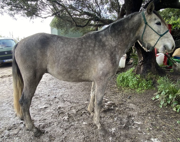 Esta hermosa y muy cariñosa yegua PRE está en venta, ya que voy a quedar demasiado pesado para ella. Lamentablemente, porque es una yegua robusta, pequeña, compacta y de tipo baroque, que aprende muy, muy rápido y será la mejor amiga de alguien, ya que es muy afectuosa y necesita cariño. Cumplirá tres años en marzo. Después de solo dos paseos, ya confiaba plenamente en mí, y tras dos sesiones de manejo con cuerda, ya pude trabajar con ella en libertad. Seguimiento libre, trotar hacia mí, y trotar y caminar en círculo sin cuerda. Todo muy dócil y amigable. También se puede tocar en cualquier parte y no hay problema con el cuidado de los cascos. El galope es con rebote. Es adecuada para jinetes ligeros o niños muy cariñosos. No es apta para reproducción, ya que sufrió un edema en la ubre debido a una garrapata. Actualmente vive con su media hermana y cuatro machos en un paddock de 5 hectáreas con pasto.