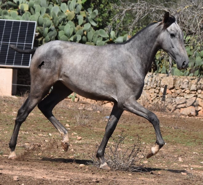 This PRE mare (Andalusian with ANCCE breed certificate), born in 05/2023, is already a magical, elegant young horse. Her pedigree is truly sensational, because on her sire's side she can be traced back to the exceptional stallion FER TEMPRANILLO, who has strongly influenced the PRE of today. On her dam's side we find the unique JUDIO VII, as well as Mejorante and Recomendado stallions! She already has great movement with lots of impulsion, despite the stony ground. But thanks to the ground and her robust attitude, she has very clear legs and good hoof quality. She lives outside 24 hours a day with a friend and is therefore well hardened in all weather conditions (it gets cold and frosty even in winter!). Her expected final height is around 160cm and she will later be open to many disciplines thanks to her good movement and agility. There is the possibility to leave her longer in Mallorca for breeding, but she would be ready to leave and come to you :) Videos and pedigree on request. Her location is Mallorca. I would be happy to organize a foal AKU on site, transport or even her trip, should you come to see her in person. Details on my site or in conversation. Saludos from Spain