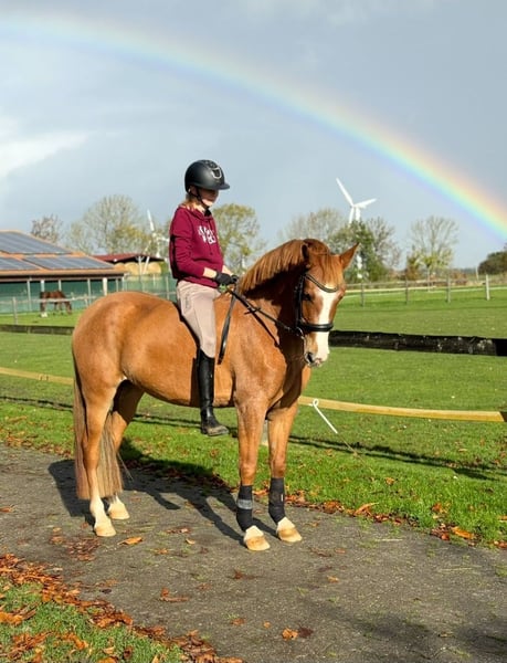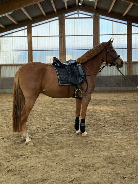 Luna is a very eager-to-learn four-year-old mare, showcasing beautiful basic gaits with potential for sport. With a height of 150 cm, she is compact enough for smaller or slightly taller riders. In handling, she is incredibly well-behaved and uncomplicated, very people-oriented, and affectionate. Under saddle, she initially needs to build trust and still has much to learn. Therefore, she is suitable only for experienced riders or ambitious riders with trainer support. Once trust is established, this stunning mare will give her hundred percent to her rider. She is very eager to learn and always aims to please, whether working from the ground or under saddle. If you're interested, you are welcome to meet the lovely Luna. She is: - Saddled and ridden - Farrier-friendly - Loading-friendly Please note: To prevent riding tourism, we charge €15 per trial ride, which will be deducted from the purchase price if you decide to buy. Luna will not be sold to dealers or riding schools. We wish for her to find a 5-star home.