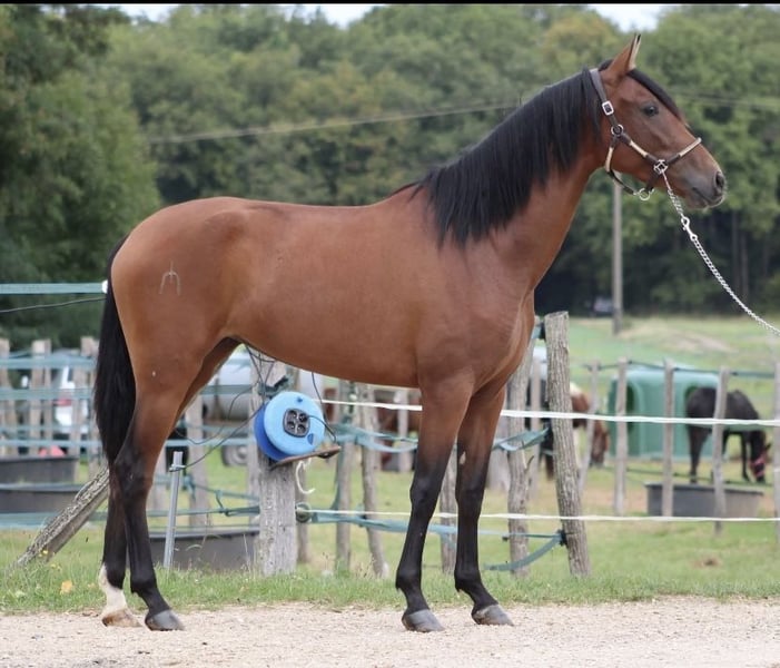 Vierjarige Spaanse volbloed merrie met volledige papieren, ongeveer 1,55 m hoog, bruin.