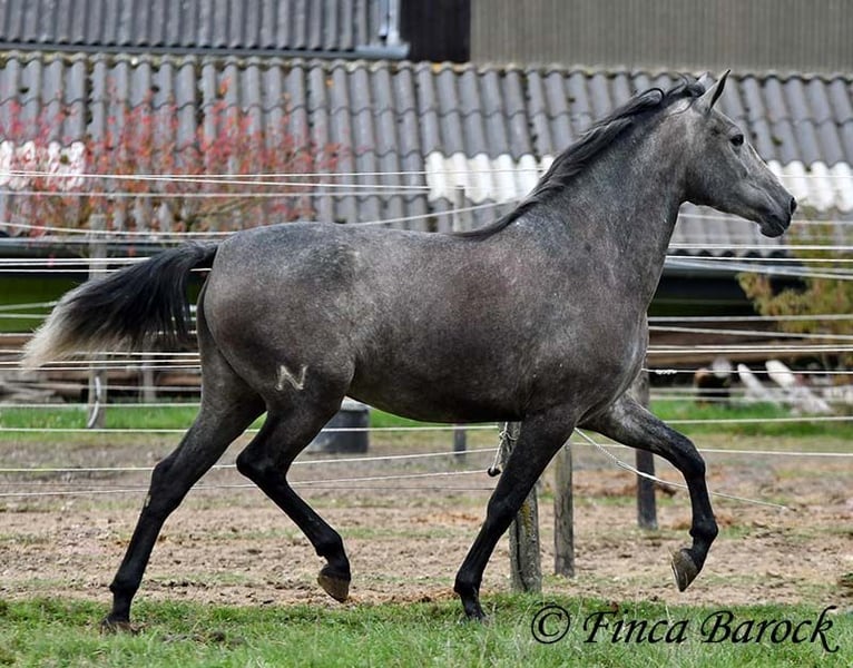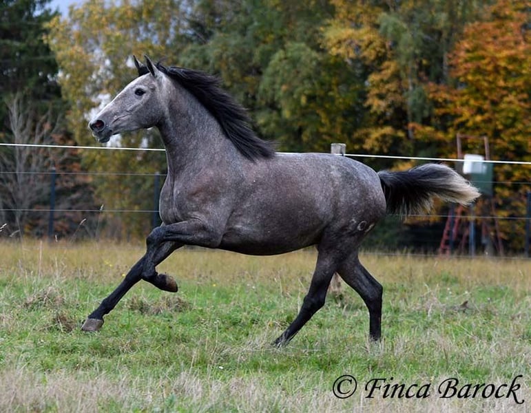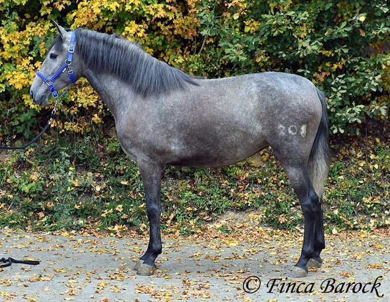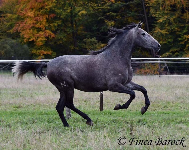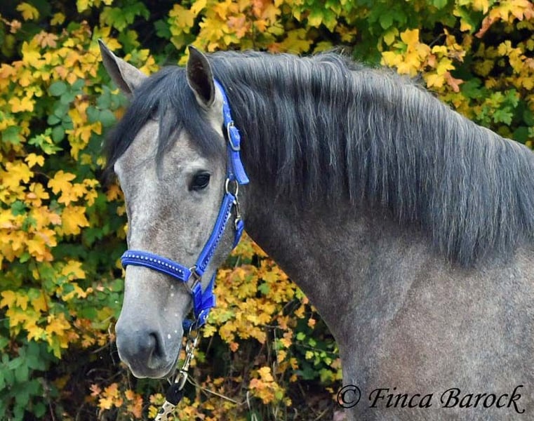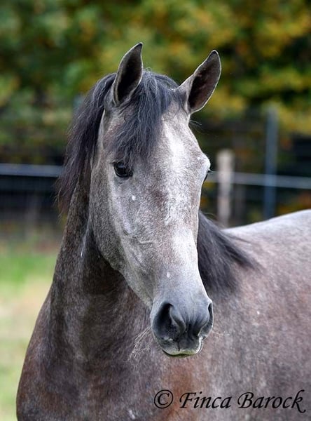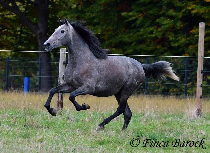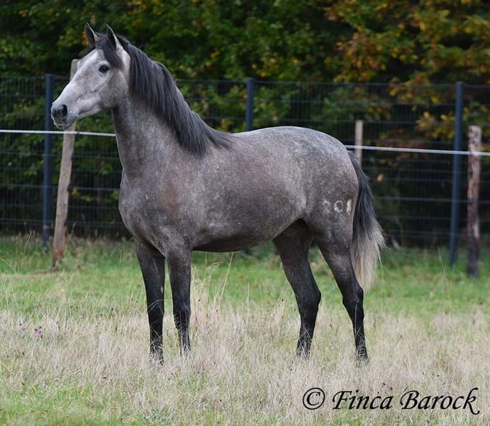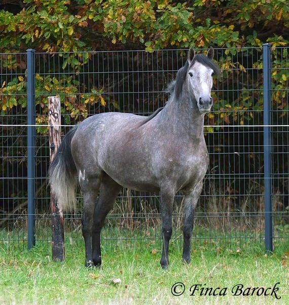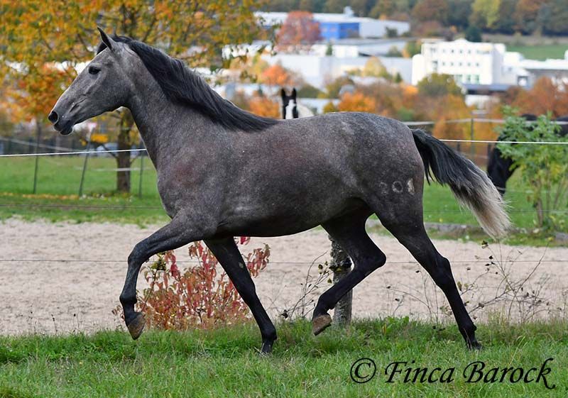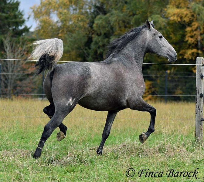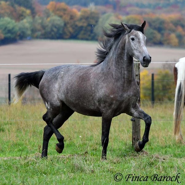 Rasse: PRE Name: Hechicera MCIX Geschlecht: Stute Stockmaß: ca 158 cm Alter: 01.03.2022 Farbe: Schimmel Preis: 9800 € Vater: Al Caprichoso v. Sir Hacendado Mutter: Bienvenida Nadales v. Grandioso de Nadales Hechicera, kompakte Statur, vereint mit super freundlichem Wesen und sitzbequmen Bewegungen. Hechicera ist eine imposante Erscheinung und mit ihren 3,5 Jahre bereits jetzt sehr kompakt. Sie steht noch voll im Wachstum und wird insgesamt noch etwas auslegen und wachsen. Hechicera ist solide in den GGA longiert am Kappzaum. Sie kennt an der Longe Stangenarbeit, Cavaletti und auch Spaziergänge an der Hand. Sie wird aktuell von uns angeritten und ist bereits in den GGA an der Longe mit Reiter sehr souverän. Das freie Reiten nehmen wir immer mehr dazu und auch hier zeigt sie sich vorbildlich. So lernt Sie Stück für Stück mehr das Leben als Reitpferd kennen. Sie zeigt sich als sehr gelehrig und ist eine absolute Musterschülerin! Hervorzuheben sind auch ihre sitzbequemen Bewegungen und Ihr traumhafter Bergaufgalopp. Sie kennt Herdenhaltung und zeigt sich hier sehr verträglich mit anderen Pferden. Mit Hechicera bekommt man eine tolle junge Lady, die bereits gute Grundlagen gelegt bekommen hat und darauf wartet weiter die Welt zu entdecken. Mit einem gutem Fundament und Rahmen, welche auch größere Reiter gut abdecken kann. Dazu trägt Hechicera den Brand von Yeguada Nadales und wäre mit ihrer Abstammung auch für Zucht interessant. inkl. klinischer tierärztlicher Untersuchung und Röntgenbildern Kontakt: Finca Barock, Tel. 0173-696 31 81, 56291 Wiebelsheim