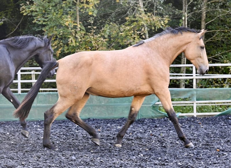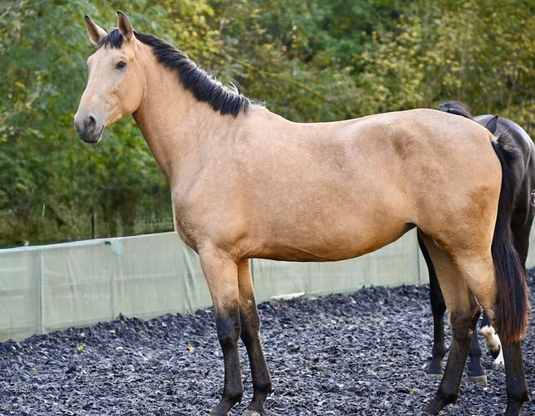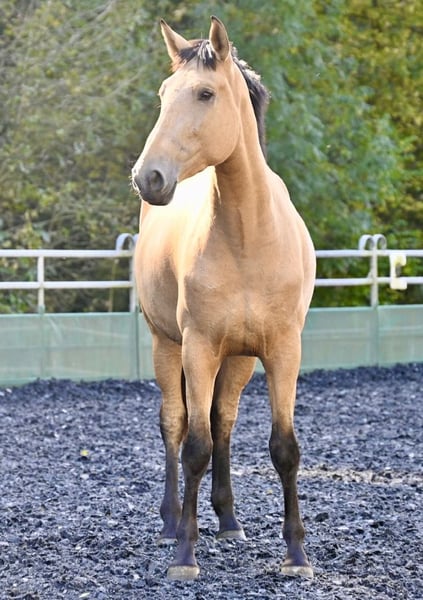 On behalf of the client: Silueta MAZ… …is a splendid purebred Spanish mare in the rare color Falbe (Buckskin/Bayo). In 2025, she foaled a healthy Palomino colt with striking green eyes. The birth was smooth, and although it was her first foal, she handled it confidently and proved to be a very caring mother. Silueta had the good fortune to grow up naturally within a herd, making her highly social and well-adjusted. In 2024, she served as a kindergarten mare for weanlings. She loves life in the open stable but is also comfortable being stabled overnight. She has been in Germany for 1.5 years and is familiar with all local customs. This year, she has been gently started under saddle; in accordance with her foal period, she is currently trained in all three basic gaits. Under saddle, she is fearless and well-behaved. An exceptionally high-quality mare, both grounded and intelligent, with a good head on her shoulders! Silueta has already been basic-licensed with a high licensing index (103.95) – she holds full ANCCE registration papers. Her bloodlines trace back to Escalera, Yeguada Militar, and Paco Martí. Her pedigree is a testament to her gait quality, size, and, not least, her nerve strength. She has been regularly dewormed, vaccinated, and presented to the farrier (barefoot). We are happy to facilitate direct contact with the owner. If you have a horse you wish to sell, please do not hesitate to contact us. We buy, take in part exchange, or market your horse for you until the final sale. More information at www.wow-pferd.de