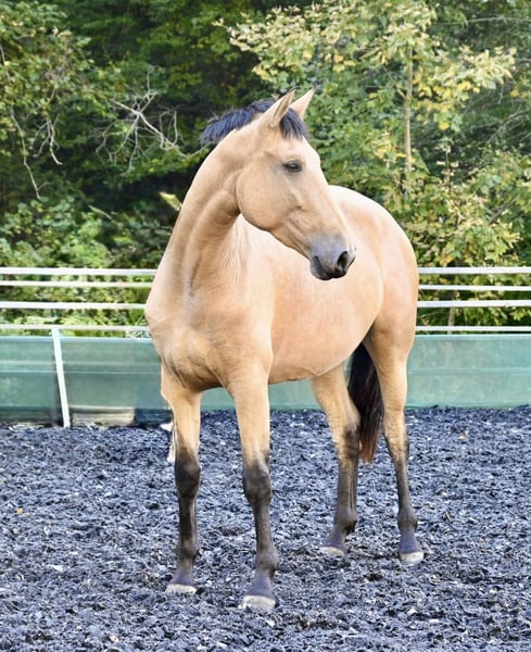 Im Kundenauftrag: Silueta MAZ… ….ist eine stattliche Pura Raza Española Stute in der Sonderfarbe Falbe (Buckskin/Bayo). Sie hat 2025 ein gesundes Palomino Hengst Fohlen mit grünen Augen zur Welt gebracht. Die Geburt verlief unkompliziert und obwohl es ihr erstes Fohlen war, reagierte sie routiniert und zeigte sich als sehr fürsorgliche Mama. Silueta hatte das Glück artgerecht im Herdenverband aufwachsen zu dürfen, demnach ist sie sozial super verträglich und bot sich 2024 als Kindergärtnerin der Absetzer an. Sie liebt das Leben im Offenstall, akzeptiert es aber auch über Nacht aufgestallt zu sein. Seit 1.5 Jahren ist sie nun in Deutschland und mit allen Gepflogenheiten vertraut. Dieses Jahr wurde sie schonend ausgebildet, der Fohlenpause entsprechend ist sie aktuell angeritten in allen drei Grundgangarten. Unter dem Sattel zeigt sie sich unerschrocken und brav. Eine überaus qualitätvolle Stute, die ebenso geerdet wie schlau ist und die mitdenkt! Silueta ist bereits basisgekört worden mit einem hohen Körindex (103.95) – selbstverständlich hat sie volles ANCCE Papier. Ihre Blutlinieren führen zurück auf Escalera, Yeguada Militar und Paco Marti. Ihrer Abstammung ist das Gangvermögen, die Größe und nicht zuletzt die Nervenstärke zuzuschreiben. Natürlich wurde sie regelmäßig entwurmt, geimpft und dem Hufschmied vorgestellt (Barhufer). Gerne stellen wir den direkten Kontakt zur Besitzerin her. Sollten Sie ein Pferd haben, welches Sie gerne verkaufen möchten, dann sprechen Sie uns einfach an. Wir kaufen, nehmen in Zahlung oder vermarkten Ihr Pferd für Sie bis zum endgültigen Verkauf. Weitere Infos unter www.wow-pferd.de