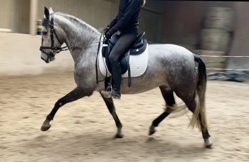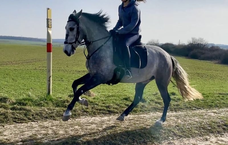 Zum Verkauf steht eine 5-jährige Spanierstute mit einem Stockmaß von ca. 1,62 m und sehr klarem, ruhigem Charakter. Sie zeigt sich im täglichen Umgang absolut brav (Putzen, Satteln, Schmied, Verladen) und ist auch unter dem Reiter angenehm und unkompliziert zu reiten. Besonders im Gelände überzeugt sie durch ihre Zuverlässigkeit – sowohl alleine als auch in der Gruppe. ✔ sehr brav und unkompliziert ✔ zuverlässig im Gelände ✔ angenehm zu reiten ✔ durch ihr ruhiges Wesen auch für Jugendliche, Wiedereinsteiger sowie Kinder unter Anleitung gut geeignet ✔ motiviert und lernwillig Sie befindet sich altersentsprechend noch in weiterer Ausbildung und entwickelt sich aktuell sehr positiv. 🩺 Aktuelle AKU inkl. Röntgenbilder ohne Befund vorhanden 🌍 Transport kann organisiert werden 🎥 Viele aktuelle Videos vorhanden – Kauf vom Video mit Gewährleistung möglich Probereiten gegen Gebühr in Höhe von 30 € möglich (wird beim Kauf selbstverständlich verrechnet)