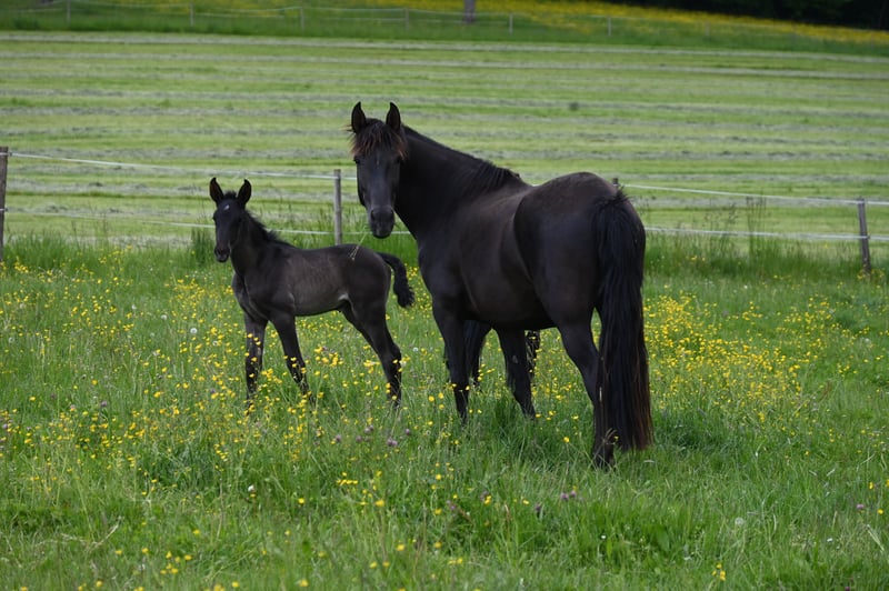 Macarena de Lucia is a 5.5-year-old PRE black mare with pure Escarlata lineage. Her breeding index is 98.31%, and she is a homozygous mare for the black color EEaa. Currently, Macarena stands at 159 cm tall, and it is likely that she may grow another 1 or 2 cm. She is very strong-minded, affectionate, and friendly. Macarena is ridden both in the arena and on trails, where she demonstrates good behavior with a pleasant forward drive. So far, she has had 2 filly foals, one of which she is still nursing until September; the births went well. The Escalera line is one of the oldest bloodlines in Spain and is the result of a consistent breeding program by a family that goes back more than 200 years. A notable characteristic of Escalera horses is their high willingness to perform, baroque, noble horses with physical strength, good rideability, and outstanding movements. The foundation of Escalera horses consisted mainly of brown mares, with few exceptions of blacks, which were then paired with the best and most athletic stallions from the Yeguada Militar. For this reason, Escalera horses are particularly suited for dressage and consistently rank high at various breeding shows. Macarena is vaccinated, regularly dewormed, and in excellent health. She is familiar with farm machinery and other farm animals as well as playing children, and she is good for the farrier and loading. After the birth of her foal, she was checked by an osteopath. Her daughter Hermosa Perla Negra can be weaned starting in September. Sire: Escogido XXIII Dam: Manzanillo XII