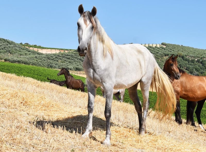 lieber Charakter, roh, steht mit anderen Stuten draußen, groß, gute Bewegungen und Abstammung, trächtig vom braunen PRE Hengst Marques AM II, das Fohlen wird für Februar 2026 erwartet, Abstammung: Cardenas, Yeguada Militar, hat mehrere qualifizierte Vorfahren www.elegante-andalusier.com
