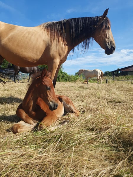 For sale is a 6-year-old chestnut mare of the Pura Raza Española breed, who captivates with her charming personality and versatile abilities. Standing at 1.60 m, she combines elegance with a strong build. This exceptional mare is skilled in groundwork and was gently started under saddle at the age of three. She possesses three spacious and comfortable basic gaits. After her training, she successfully raised two foals and has proven to be a wonderful and caring mother. What makes her special Our mare is not only a beauty but also an asset to any herd. She is sociable and easy to handle. Naturally, she is very well-behaved with the farrier and loads onto the trailer without any issues. Now for the super bonus: She is in foal to the Quarter Horse stallion "Silver Prime" for an Azteca foal (papers from the USA or Mexico possible), expected in May 2026. Due to the genetic combination, only the two special colors, Silver Bay or Silver Buckskin, are possible. The last photos show the father of the future foal. This mare is ideal for breeders as she is easy in the herd, brings foals into the world completely uncomplicated, and accepts them without any problems. The wonderful current Azteca foal is still at her side until the end of October/mid-November, after which she could move out.