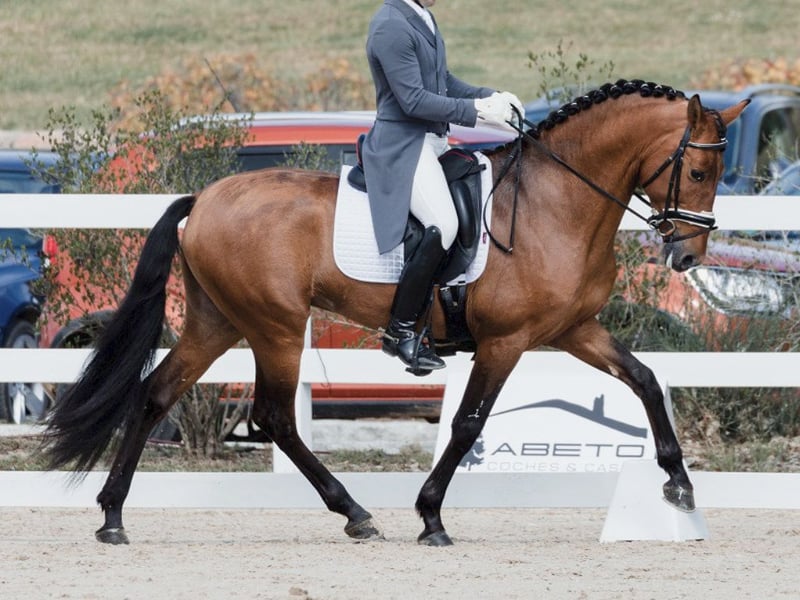 Este precioso caballo PRE de aspecto impecable y con una morfología bien proporcionada, goza de unos andares bien equilibrados, mostrando una gran fluidez en los cuartos traseros y una buena acción de los cuartos traseros en cada paso. Bajo la silla de montar, este caballo ofrece un paseo cómodo, manteniendo un contacto ligero y agradable, siempre con ganas de avanzar. Este precioso caballo español se esfuerza por complacer a su jinete, tratando de dar lo mejor de sí mismo cada día. Cuando está montado realiza hermosos ejercicios laterales, piruetas y cambio de vuelo a tres tiempos, con experiencia en competencia creemos que es un caballo muy interesante para un jinete aficionado que quiere seguir construyendo sobre el trabajo que ha realizado para continuar al siguiente nivel. Sus orígenes son fabulosos, es nieto y bisnieto por parte paterna de criadores cualificados de la yeguada Dehesa de Cabeza Rubia, yeguada conocida por la funcionalidad de sus productos. Su línea materna tiene excelentes orígenes, así como por parte de su padre, sus abuelos y bisabuelos maternos también son criadores calificados, lo que lo convierte en un caballo a tener en cuenta no solo para la doma, sino también para la cría de sementales. Chequeo veterinario disponible, para posibles clientes interesados.