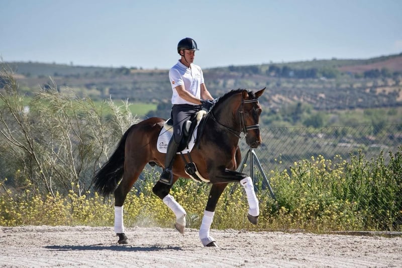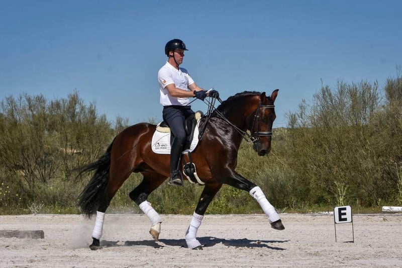 Szkoleniowy ogier PRE wolny od Piro, urodzony w 2016 roku, wykonujący niemal wszystkie ćwiczenia na poziomie GP.