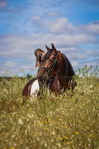 Gentle and respectful with people and other horses, he is a sweet-hearted horse with excellent character—free of spookiness, stallion manners, and fully trustworthy. He is accustomed to working alone or with other horses and mares in the arena, as well as riding in the countryside, both alone and with company.
