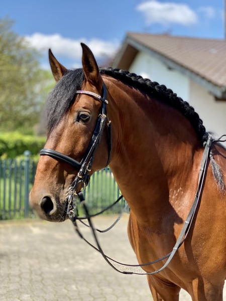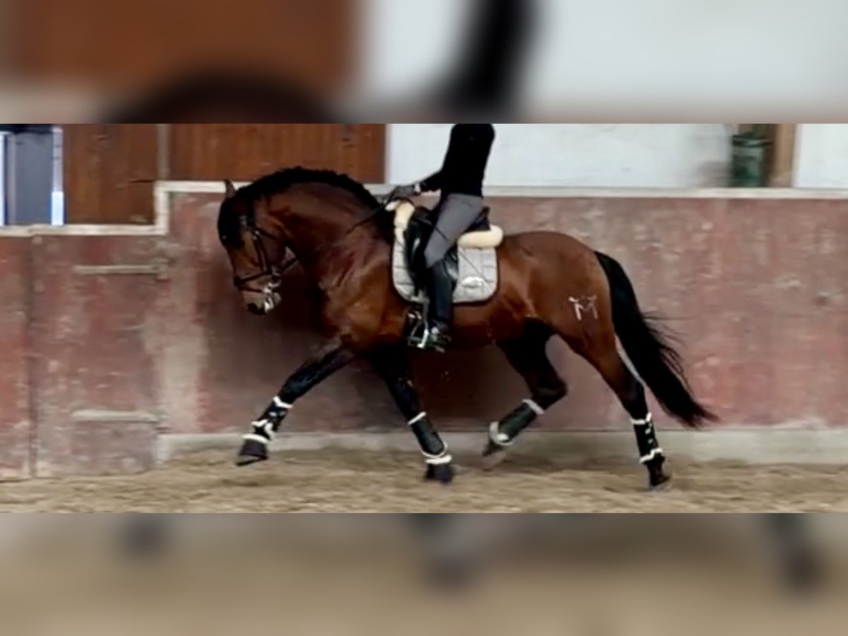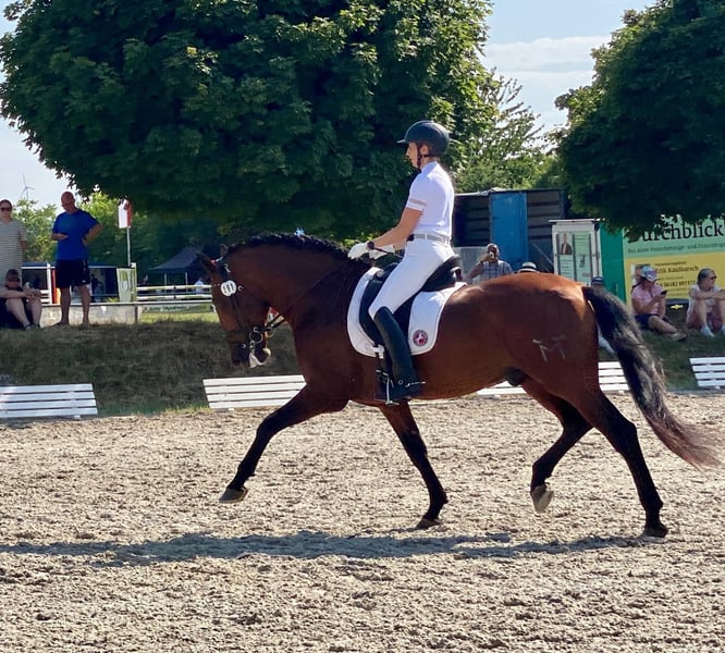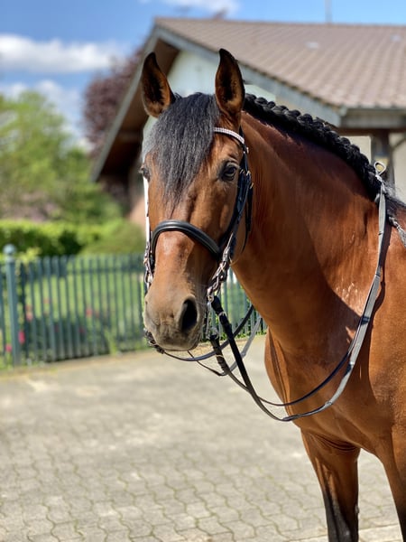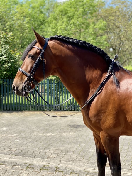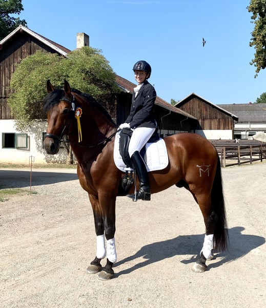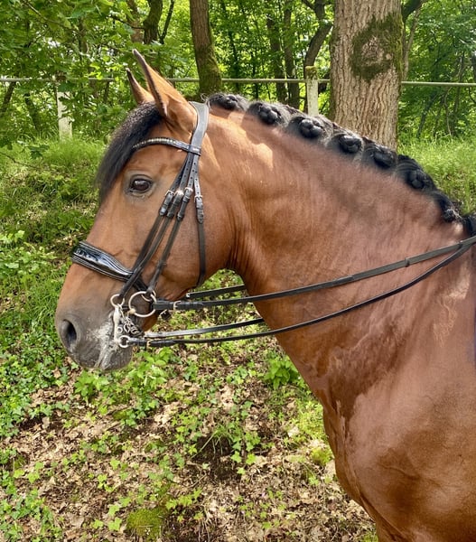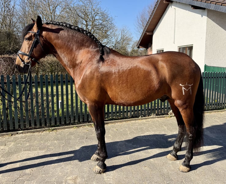Uruguayo XXVII PRE / Hengst / 24.11.2014./ braun / 169cm V: Academico VII, M: CRIOLLA III, MV: MEJICANO XXV Wunderschöner, gut bemuskelter, brauner PRE Hengst mit sehr guten Grundgangarten, viel Schweif und Mähne. Ausbildung Solide und mit Ruhe ausgebildeter Hengst für Dressur, Freizeit, Gelände und Working Equitation. Ausgebildet bis Klasse M in Richtung S, anpiaffiert. Turniererfahren (FN Turniere), vorgestellt und platziert A bis M. Erste Erfahrungen in Working Equitation. Spanischer Schritt angefangen, Geländesicher (alleine/Gruppe). Charakter / Temperament Ein Hengst mit einwandfreiem Charakter, absolut keine Hengstmanieren. Er wird mit einem anderen Hengst gemeinsam zur Koppel geführt und steht unbeeindruckt neben der Stutenherde. Er ist sehr verschmust, brav und unkompliziert im Umgang, auch mit Kindern, arbeitswillig und intelligent, lernt gerne und schnell Neues und mag Abwechslung. Ein Familienpferd aus allerbesten Verhältnissen, Gesundheit Guayo ist ordnungsgemäß geimpft und entwurmt (zuletzt abgestimmt auf Basis einer Kotanalyse), läuft aktuell hinten Barhuf, vorne mit Kunststoffbeschlag (er war vorher aber lange Zeit 4x normal beschlagen), AKU kann auf Wunsch selbstverständlich durchgeführt werden. Haltung Aktuell Stall/Boxenhaltung mit Wallachen, Hengsten und Stuten in direkter Nachbarschaft. Täglich Paddock/Koppelgang. Standort DE / 64380