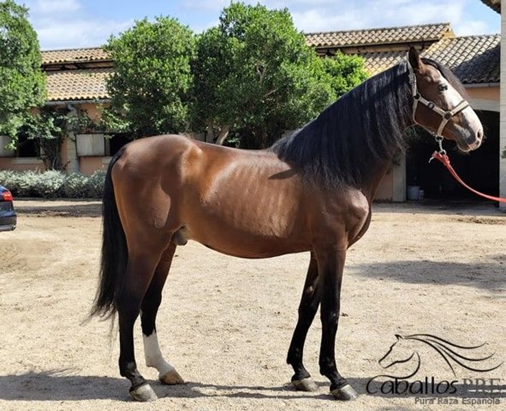 Gender: Stallion - Approved Born: 2012 Breed: P.R.E Color: Bay Height: approx. 1.68/69 m Father: Juglar XXVI Mother: upon request Training level: Ridden Price range: 5000.- - 10.000 Location: Spain Quiebro is a lovely, recreationally ridden approved P.R.E stallion with great size. He has three offspring and has otherwise only been ridden recreationally in the countryside. He could certainly be gelded upon request, but he showed no stallion behavior during our meeting. A great, stately P.R.E stallion who stands out immediately due to his distinctive, large blaze and is a real eye-catcher. He presented himself to me as very well-behaved, cool, and people-oriented. Due to his lineage, he is very interesting for breeding: paternally Juglar XXVI x Omni, maternally through Hacendoso XVIII - Poseido VII. If you would like more information about him, please contact us by phone. We are happy to send videos after a personal conversation. Anonymous inquiries will not be answered. Transport can be organized worldwide. Viewing is possible at any time by appointment.