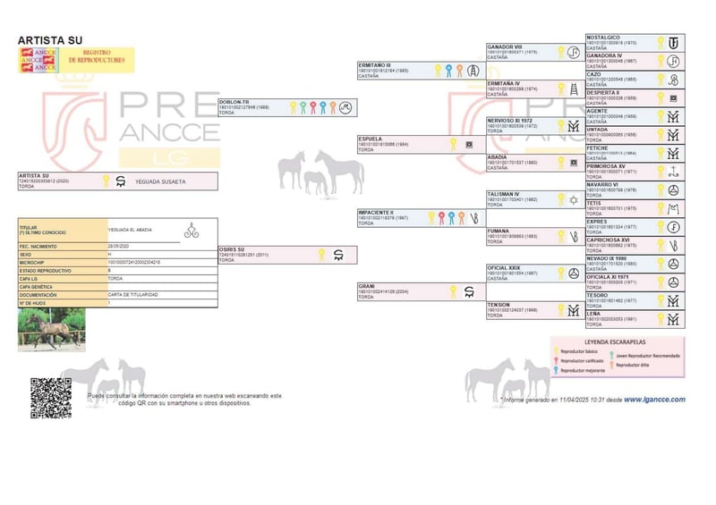 Dalí del Abadia is a very well-built Pura Raza Española colt born on 19.05.2025. Dalí stands out with his impressive build at just 3 months old. Like his mother, he is a calm, patient type who quietly enjoys all the attention he receives. He is growing up with his siblings in the herd but is also familiar with the halter and has already been transported a few times. Dalí combines several impressive bloodlines; his mother Artista Su is a daughter of elite stallion Doblón-TR and on his mother's side, he is a granddaughter of elite stallion Impaciente II. Our stallion Bien de Scuderia (last 3 photos) is a son of the legendary Poeta de Susaeta. If you would like more information about Dalí or would like to get to know our breeding farm, please feel free to contact us. You can also find us on our website, Facebook & Instagram (Yeguada El Abadia).
