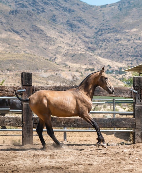 Jonge PRE-hengst, geboren in maart 2024. Buckskin vacht en momenteel 1,65 m op de withers. Uitstekend van aard met een zeer zachtaardig en rustig karakter. Hij is gewend aan kinderen en honden.