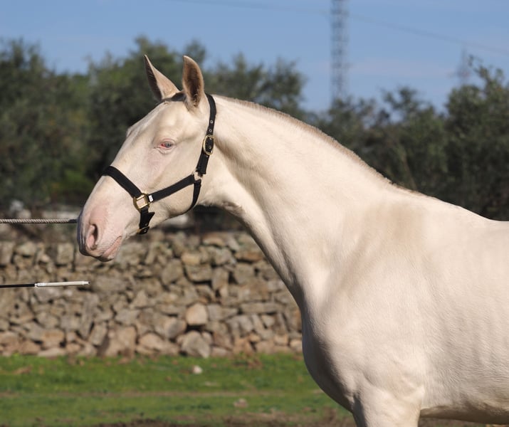 We present an exceptional perlino Pure Spanish Horse (PRE) colt, born in 2024 and currently standing at 164 cm. This young colt is sired by Bronco XLV, a renowned stallion known for his power, baroque morphology, and balanced temperament, and out of Topolina GSA, a mare of great nobility and quality movement. This results in a strong and functional genetic line with great potential for disciplines such as classical dressage or selective breeding. With an expressive look, free and ample movements, and a curious and sociable nature from an early age, this colt represents a unique opportunity for those seeking an exclusive PRE with beauty, proven bloodlines, and special genetics. An excellent investment for future breeders aiming to improve their lines—this colt is now available to the most demanding riders or stud owners.