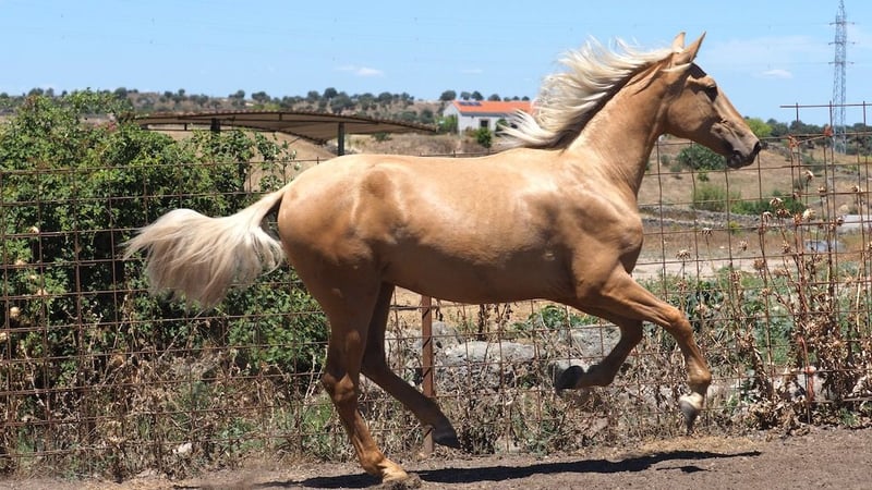 Beau poulain palomino avec une belle couleur palomino qui contraste avec sa crinière. Avec une bonne taille actuellement, il promet d'être un poulain de bonne taille car son père et sa mère ont tous deux beaucoup de taille. Arrière-petit-fils d'Ucles II, étalon qualifié de Yeguada Militar, ce poulain palomino aux formes correctes et aux bonnes allures, promet d'être un étalon intéressant pour les amateurs qui souhaitent avoir un étalon espagnol spécial.
