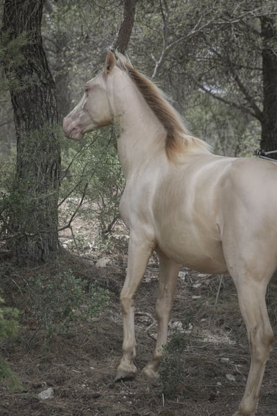 MANTECADO Just like his name – Mantecado – he is pure sweetness. Named after the traditional buttery treat made with milk, eggs, and sugar, there's no better way to describe him: soft, kind, and full of charm. He was born into a loving home, surrounded by affection and gentle care. A friendly and affectionate colt, Mantecado seeks human connection and loves cuddles. You can lean on him, hug him, and he’ll always welcome your touch with serenity. He is familiar with all basic care: regularly dewormed, hooves trimmed every six weeks, and fed a balanced, natural diet of meadow hay, alfalfa, Swiss herbal flakes, and a bit of muesli. He also receives biotin and mineral supplements to support healthy bone and joint development. Mantecado lives in freedom, sharing his space with a mixed herd – wise older mares who teach him boundaries, a playful mini Shetland pony, and other young colts for socialization. We truly believe that a diverse herd is the best environment for a young horse to grow emotionally and socially. He enjoys outdoor life 24/7 with full freedom to move, play, and simply be a horse. He has also started going on short walks in the forest on the lead rope, showing calmness and curiosity. Thanks to his unique coat, he carries the CrPrl gene, which makes him interesting for a breeding program as well. Mantecado is a colt who wins hearts with his sweet and gentle nature. If you believe you can offer him a life full of respect, freedom, and love, we’d love to hear from you. He will not be sold to a home where he would be kept in a stall 24 hours a day. Only loving homes that can meet his natural needs will be considered.