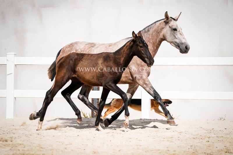 Foal: Size: The foal has already reached an impressive height of 135 cm. Genetics: Due to its pedigree, the foal carries interesting genetic traits. While his mother has one PRL gene, his father inherits two Prl genes. Appearance and gait: This PRE black foal impresses not only with an athletic physique, but also with an elegant and fluid gait, which will be an advantage in dressage and other disciplines. Face: A special feature of the foal is its fine and beautiful face, which makes it appear particularly expressive and melts every heart. Versatility: Despite its young age, the foal is already showing that it is ready for all aspects of life, be it in sport, leisure or simply as a loyal companion. In summary, this foal is not only genetically interesting, but also a promising young animal with outstanding physical and character traits. It has the potential to excel in many different areas of equestrian sports and beyond.
