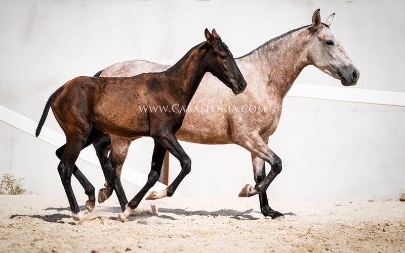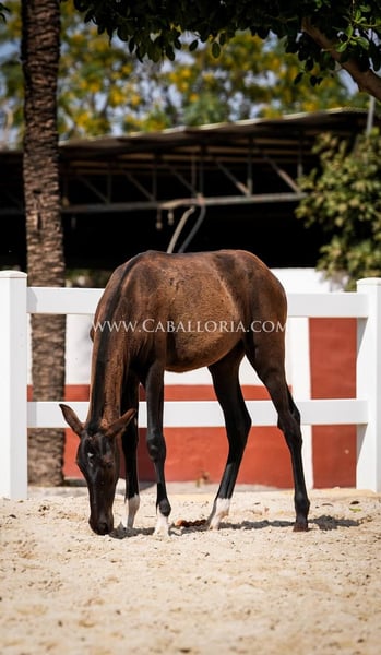 Potro: Tamaño: El potro ya ha alcanzado la impresionante altura de 135 cm. Genética: Debido a su pedigrí, el potro es portador de interesantes rasgos genéticos. Mientras que su madre tiene un gen PRL, el padre hereda dos genes Prl. Apariencia y andadura: Este potro PRE negro no sólo impresiona por su complexión atlética, sino también por una andadura elegante y fluida que será una ventaja en doma y otras disciplinas. Cara: Una característica especial del potro es su cara fina y hermosa, que le hace parecer especialmente expresivo y derrite todos los corazones. Versatilidad: A pesar de su corta edad, el potro ya demuestra que está preparado para todos los ámbitos de la vida, ya sea en el deporte, el ocio o simplemente como fiel compañero. En resumen, este potro no sólo es genéticamente interesante, sino también un animal joven y prometedor con rasgos físicos y de carácter sobresalientes. Tiene potencial para destacar en muchos ámbitos diferentes del deporte ecuestre y más allá.