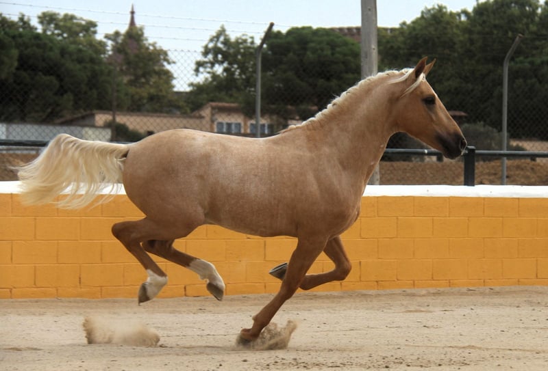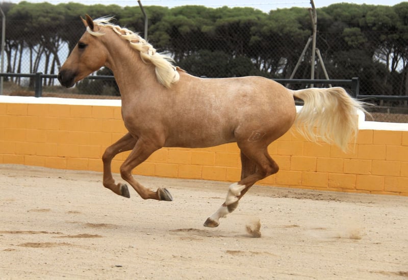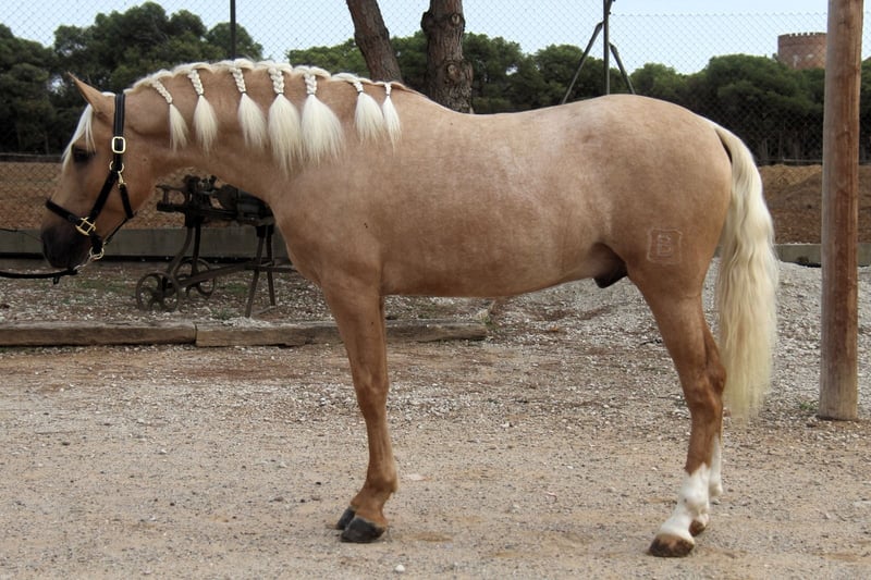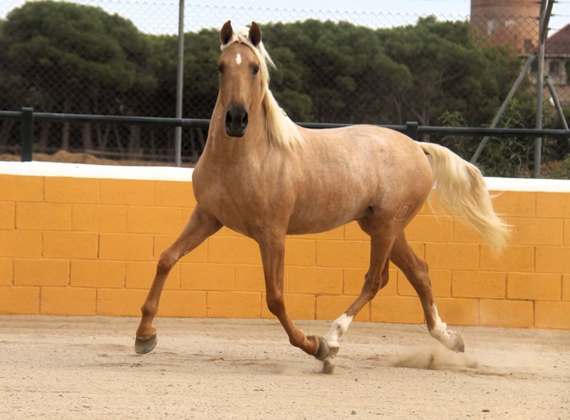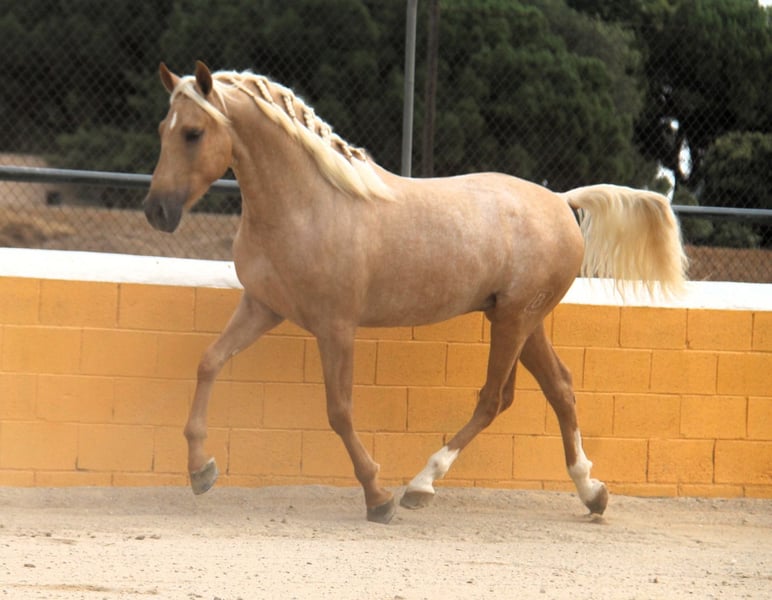 This stunning PRE stallion in the special color Palomino is looking for his soulmate. He has a wonderful and warm presence and beautiful gaits. In terms of character, he is very sweet, open-minded, and polite. He is 3 years old and currently about 1.59 m tall. We estimate he will reach around 1.65 m when fully grown. He is currently being prepared for riding, which he is handling very well. In the future, we can envision him in many areas, including dressage, working equitation, shows, breeding, or simply as a leisure partner. He comes from a great breeding program. He spent his childhood in a large herd of mares and their foals in the pasture, and at about 8 months old, he was separated from his mother and was able to socialize in a young stallion herd. He has now been stabled, so he is already familiar with the box. He already has X-rays that show no findings. If desired, he can also be castrated on-site in Spain. Location: Barcelona, Spain; a meeting in Spain and transport can be easily organized.