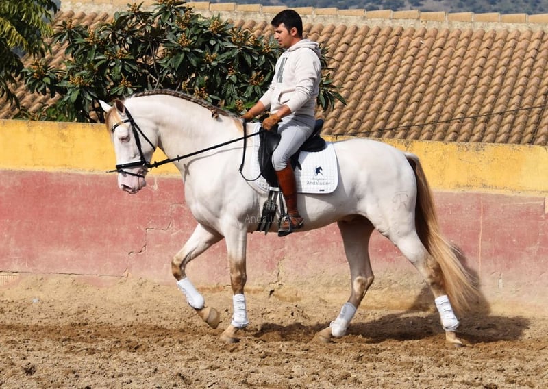 Charactère doux avec un tempérament agréable, curieux et câlin, monté en allures de base, exercices de côtés, reculer, pas espagnol, début de piaffer et de passage, se plie, en terrain, grand, bons mouvements, couleur spéciale, Bayo Perla (CrPrl) avec papiers PRE, inscrit, Piro négatif, adapté aux enfants et aux cavaliers peu expérimentés. Ascendance : Yeguada san Benito Abad, Paco Martí, Yeguada la Llana, Ururopa Gaucho III est qualifié. www.elegante-andalusier.com