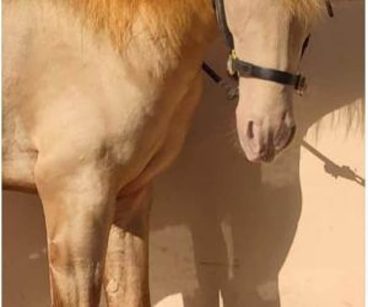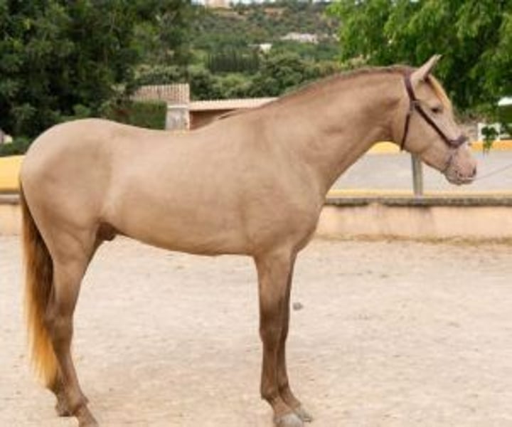 Future stallion and extraordinary life companion This young 4-year-old stallion grew up in freedom, in an environment that allowed him to develop peacefully. While many foals begin ridden at 3 years old, his owner preferred to give him an extra year to properly train. He is now at the ideal time to begin work. Now that he's ready to take his first steps under saddle, seeing him in front of you confirms that the wait was worth it. It's not just his coat Isabella— rare and highly sought after at PRE — which attracts attention, but also its attitude: a calm young horse, with a frank gaze, who readily accepts proximity and contact. From the very first moment, he exudes a serenity that makes you want to work with him. He lets himself be caught without difficulty, remains calm when tied up, gives his feet with confidence and lets himself be touched everywhere. For a stallion who has not yet started breaking in, he shows remarkable assuranceHe doesn't get agitated, doesn't get ahead of things: he waits, listens and responds. And at that age, that's already very telling. When he moves, he's a pleasure to watch. He has a broad, supple trot, a steady walk, and a well-balanced canter. With these qualities, he'll be able to progress in both dressage and working disciplines. He feels natural, with good aptitude for whatever you ask of him. And if you're interested in reproduction, here's an added bonus: he is a carrier of the gene Cr, which guarantees that he will systematically transmit diluted coats to his foals (palominos, golden bays, creams, isabelles, etc.). This is a great opportunity for anyone looking to acquire a different horse, with real added value. Its genetics will allow you to breed foals that are highly sought after on the market, while enjoying a daily companion with a strong character and a beautiful presence. An investment that is lived to the fullest... and which can also generate a good return thanks to the coverings, because its profile is highly sought after by breeders of PRE with diluted coats. At IberHorse, we select horses according to the same criteria we would use for ourselves: character, quality and ease of work. If this young Isabelo matches what you are looking for, we will be happy to tell you more and arrange a visit.