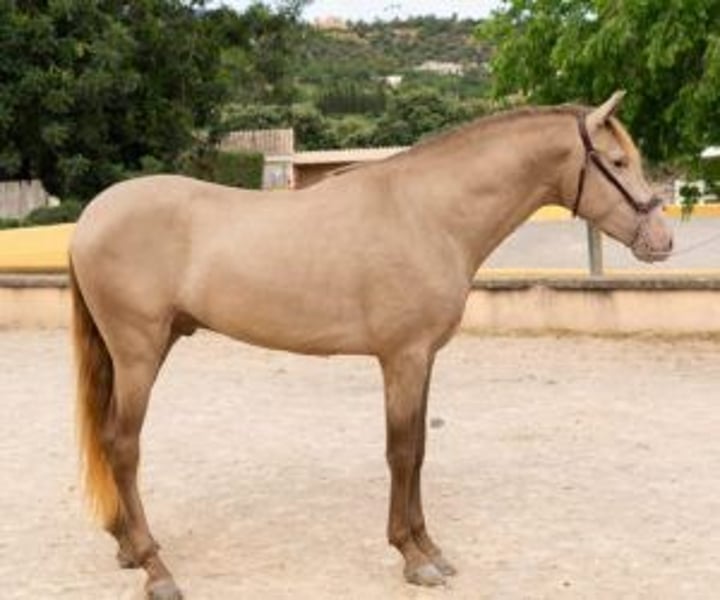 Future stallion and extraordinary life companion This young 4-year-old stallion grew up in freedom, in an environment that allowed him to develop peacefully. While many foals begin ridden at 3 years old, his owner preferred to give him an extra year to properly train. He is now at the ideal time to begin work. Now that he's ready to take his first steps under saddle, seeing him in front of you confirms that the wait was worth it. It's not just his coat Isabella— rare and highly sought after at PRE — which attracts attention, but also its attitude: a calm young horse, with a frank gaze, who readily accepts proximity and contact. From the very first moment, he exudes a serenity that makes you want to work with him. He lets himself be caught without difficulty, remains calm when tied up, gives his feet with confidence and lets himself be touched everywhere. For a stallion who has not yet started breaking in, he shows remarkable assuranceHe doesn't get agitated, doesn't get ahead of things: he waits, listens and responds. And at that age, that's already very telling. When he moves, he's a pleasure to watch. He has a broad, supple trot, a steady walk, and a well-balanced canter. With these qualities, he'll be able to progress in both dressage and working disciplines. He feels natural, with good aptitude for whatever you ask of him. And if you're interested in reproduction, here's an added bonus: he is a carrier of the gene Cr, which guarantees that he will systematically transmit diluted coats to his foals (palominos, golden bays, creams, isabelles, etc.). This is a great opportunity for anyone looking to acquire a different horse, with real added value. Its genetics will allow you to breed foals that are highly sought after on the market, while enjoying a daily companion with a strong character and a beautiful presence. An investment that is lived to the fullest... and which can also generate a good return thanks to the coverings, because its profile is highly sought after by breeders of PRE with diluted coats. At IberHorse, we select horses according to the same criteria we would use for ourselves: character, quality and ease of work. If this young Isabelo matches what you are looking for, we will be happy to tell you more and arrange a visit.