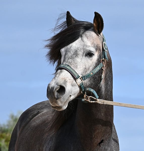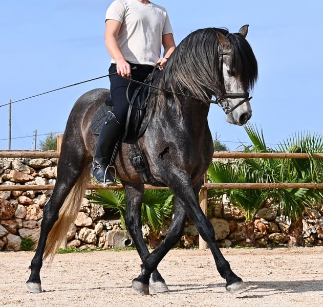 Dieser 2021 geborene, reinrassige PRE Hengst (Andalusier mit Rassenachweis der ANCCE), kommt von einem sehr pferdefreundlichen Züchter. Bis 3.5 Jahre durfte der Bursche komplett roh in der Hengstherde aufwachsen und einfach Pferd sein und seine Sozialkontakte bestens pflegen. Nun lebt er in einer großen Paddockbox und als Nachbarn hat er seine Kumpels, mit denen er großwerden durfte. Diese Aufzucht und Haltung macht sich bezahlt, denn er ist absolut tiefenentspannt, dem Menschen gegenüber sehr achtsam und selbst wenn ihm beim Putzen ein Pony am Schweif herumzupft, weil der Paddock neben dem Putzplatz ist, wackelt er nicht einmal mit den Ohren. Er ist ein ganz ruhiger und in sich ruhender Bub, was auch in der Ausbildung berücksichtigt wird. So wird weder mit Hast noch Unruhe gearbeitet, sondern ihm wird Zeit gegeben und er ist zwar im Ausbildungsstand eher mit einem 4jährigen zu Vergleichen, aber das ist nur ein Vorteil, wenn man weiß und merkt, es wird schonend gearbeitet (aktuell 3x pro Woche). Es werden immer wieder Ruhephasen am langen Zügel gemacht und er lernt immer besser sich zu strecken, was schön zu sehen ist. Trotz steiniger Böden geht er auch im Gelände problemlos barhuf und hin und wieder den Reitplatz gegen einen schönen Ausritt zu tauschen, das mag er auch gerne. Schon als Fohlen war er sehr barock und sein Exterieur ist vom "alten Schlag". Dafür steht auch seine Abstammung, denn er ist MONIS, SA SINIA, CAMPO BAJO und YEGUADA MILITAR gezogen (Cartujano). Mit aktuell 157cm ist seine Größe auch harmonisch zum Exterieur und er ist kompakt, dabei aber wendig, was ihn auch für die Working Equitation oder Westernreiten interessant macht. Unterm Reiter ist er mit der Aufmerksamkeit immer beim Menschen und sehr bemüht. Er hält auch schon relativ gut den Kontakt, aber altersbedingt braucht er noch etwas mehr Gleichgewicht und Schub von hinten (wie gesagt, er wird nicht gehetzt in der Ausbildung sondern langsam aufgebaut). Er wird auf Wassertrense geritten und laterale Arbeiten sind angefangen- ansonsten hat er eine stabile Basisausbildung. Auch im Umgang ist er ein Gentleman, sei es beim Hufe geben oder satteln (Videos vorhanden). An der Hand lernt er den spanischen Schritt und hat beim Standbild gezeigt, wie gut er den kann und wie schön seine Schulterfreiheit ist ;) Für all jene, denen keinen Hengsthaltung möglich ist, besteht selbstverständlich die Option der Kastration vor Ort. Sein zu erwartendes Endmaß wird um die 160cm, jedoch durch sein barockes Erscheinungsbild wirkt er größer und deckt sehr gut ab. Sein Standort ist Menorca. Videos und Abstammung gerne auf Anfrage. Gerne organisiere ich vor Ort eine AKU, Beritt, Kastration, Transport oder auch ihre Reise, sollten Sie persönlich zum Anschauen kommen. Details dazu gerne auf meiner Seite oder im Gespräch. Saludos aus Spanien