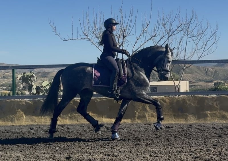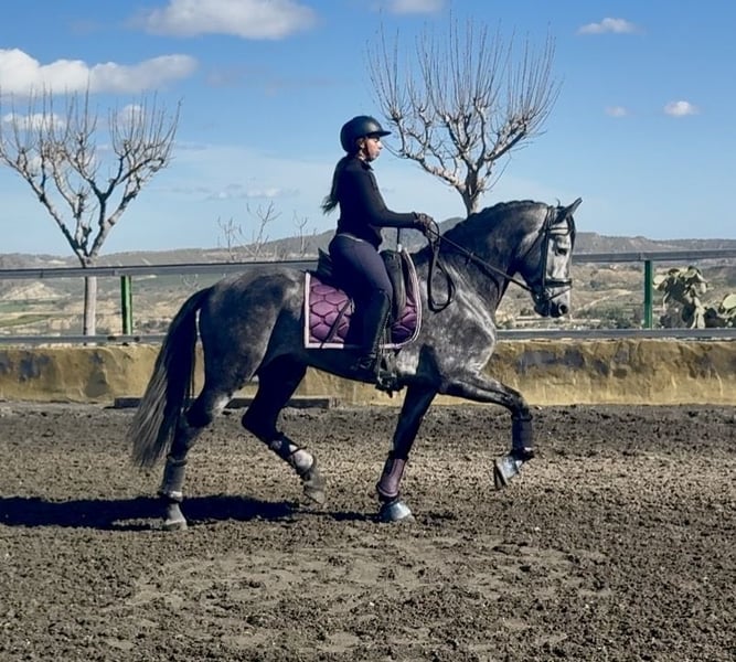 Name: Bilbaíno MG II Breed: Pure Spanish Horse (Pura Raza Española) Age: 5 years Height: 1.68 m at the withers Line: Marín García Gender: Stallion Color: Grey (Tordo) Level: Level 1 Price: €15,500 This horse has excellent conformation, presence, and great potential, making it particularly suitable for classical dressage. He stands out for his quality of movement, balance, and power. He is correctly trained in all three gaits, with clean transitions and good handling both in the arena and in the field. A horse with character and energy, ideal for a rider looking for a horse with drive and quality. 📍 Located in Spain, Murcia 🎥 Videos available, both at rest and mounted
