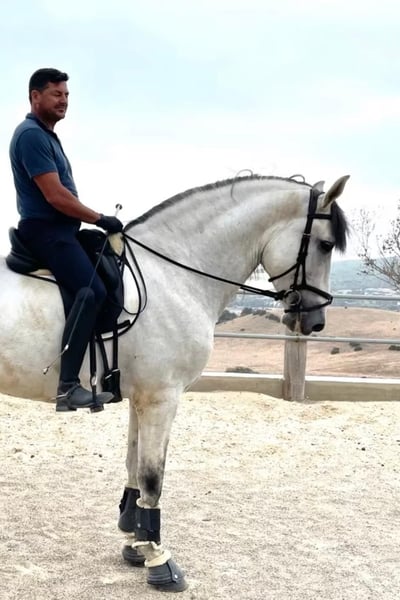 Ik wil u vandaag voorstellen aan deze prachtige 5-jarige PRE-hengst, "Ringo". Met zijn 1,72 m is hij een zeer groot exemplaar van zijn ras en heeft hij toch een barokke type uitstraling! Met zijn mooie exterieur, de lange dichte manen en zijn uitstraling voldoet hij aan het beeld van de klassieke PRE! Wat vooral opvalt, is zijn liefdevolle karakter! De hengst is zeer mensgericht, vriendelijk en zeer goed getraind! Ringo is voorzichtig opgeleid in de drie basisgangen en toont zich onder het zadel zeer leergierig! Zijn bewegingen mogen er zeker zijn! Hij doet altijd zijn best om alles correct te doen! Ik ken de hengst persoonlijk! Hij staat bij een vriend in Andalusië/Tarifa! Alle paarden uit deze lijn kenmerken zich door hun liefdevolle karakter. Ze zijn zeer mensgericht en buitengewoon braaf! Een castratie ter plaatse is mogelijk. Het transport kan gerust geregeld worden! Bij vragen kunt u gerust contact met mij opnemen!