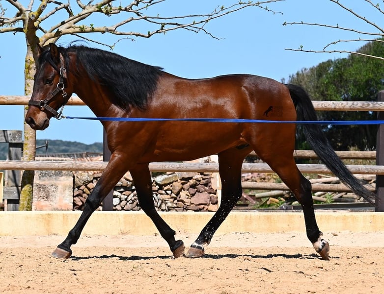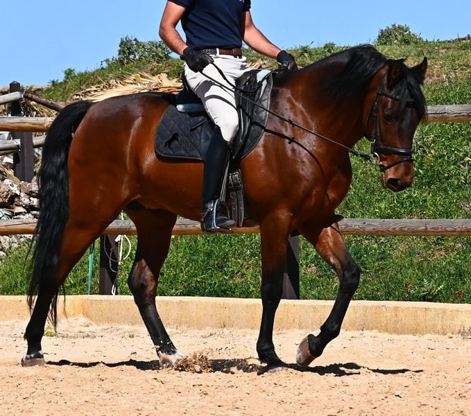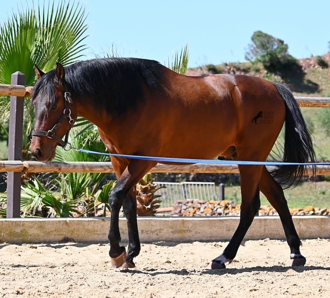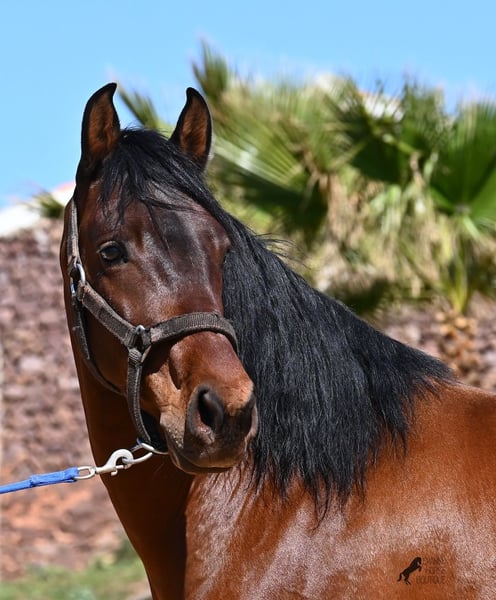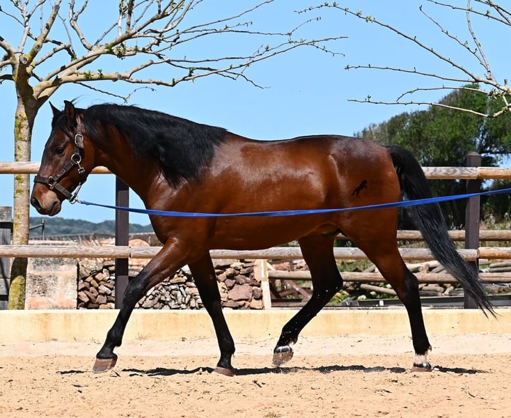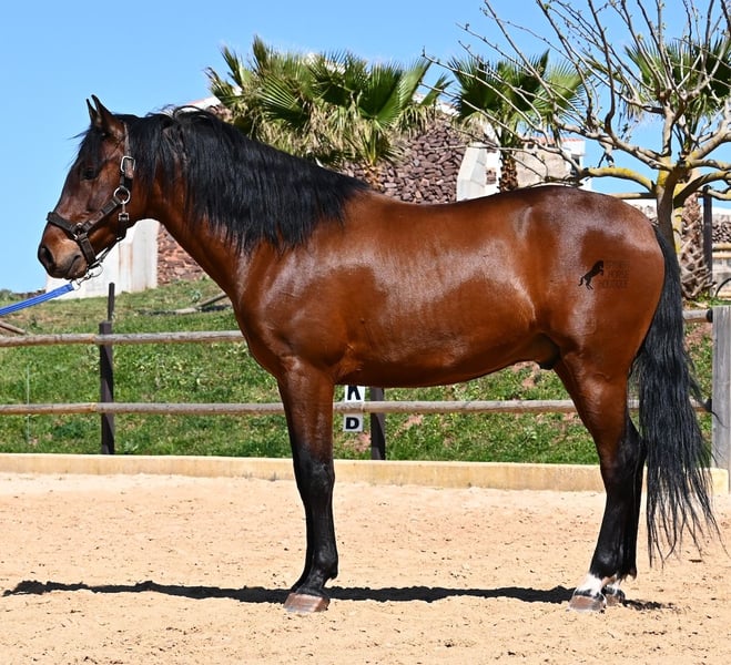 Dieser 2020 geborene, reinrassige PRE Hengst (Andalusier mit Rassenachweis der ANCCE), ist ein richtiges Powerpaket der nur so vor Elan bei der Arbeit strotzt! Er kommt von einem liebevollen Züchter, wo Spätentwickler wie die Spanier, das bekommen, was sie wirklich brauchen- Zeit! So ist er bis 3 in der Hengstherde komplett roh gestanden, wurde dann kurzzeitig aufgestallt, um die Basics zu lernen und dann wieder in den Urlaub entlassen, um alles mit Zeit zu verarbeiten. So hat er aktuell eine gute Basis unter dem Sattel, wo besonders darauf geachtet wird, dass er gut zu differenzieren lernt, zwischen seinem Vorwärtsdrang und Ruhephasen unter dem Reiter. Er lernt immer besser, sich selbst zu tragen, sich zu strecken und Ruhephasen zu verlängern, was sehr schön zu sehen ist. Ein Pferd, dass nicht in der Ausbildung gehetzt wurde, sondern sich erst finden darf und lernt die Energie zu lenken. Und Arbeitswillen hat er ohne Ende! Wo anderen schnell die Puste ausgeht, gibt er mehr und ist unermüdlich, womit er bestimmt ein Ideales Pferd für sehr ambitionierte Reiter ist, die gerne regelmäßig und gezielt trainieren. Geritten wird er auf doppelt gebrochener Wassertrense und ist nur an den Vorderhufen beschlagen. Nachts lebt er auf einem Hengstpaddock, was seinem Kopf auch sehr gut tut und tagsüber ist er in der Box für fürsorgliche Pflege und die korrekte Fütterung ist so besser garantiert. Ausritte auf dem hektargroßen Areal tun ihm auch gut und man merkt richtig, wie er da in seine Mitte findet, als positive Abwechslung zum Viereck. An leichten Arbeitstagen geht er in die Führmaschine und wird auch so weiter bemuskelt, ohne Gewicht zu tragen. In seiner Abstammung finden wir Ausnahmehengste wie YACO de TORRELUNA, ERMITAÑO III und sein Bruder ist sehr erfolgreich in der Dressur und hat es sogar zum SICAB (Weltmeisterschaft der PRE) geschafft. Er hat noch nicht gedeckt und kennt es, in der Nähe von Stuten zu sein, wobei die Option der Kastration vor Ort, selbstverständlich besteht. Aktuell misst er 157cm und hat ein schön barockes Exterieur, mit einem feinen Spanierkopf und guten Bewegungen, die ihn für viele Sparten mit hohem Arbeitsniveau interessant machen. Preiskategorie E! Sein Standort ist Menorca. Videos und Abstammung gerne auf Anfrage. Gerne organisiere ich vor Ort eine AKU, Beritt, Kastration, Transport oder auch ihre Reise, sollten Sie persönlich zum Anschauen kommen. Details dazu gerne auf meiner Seite oder im Gespräch. Saludos aus Spanien
