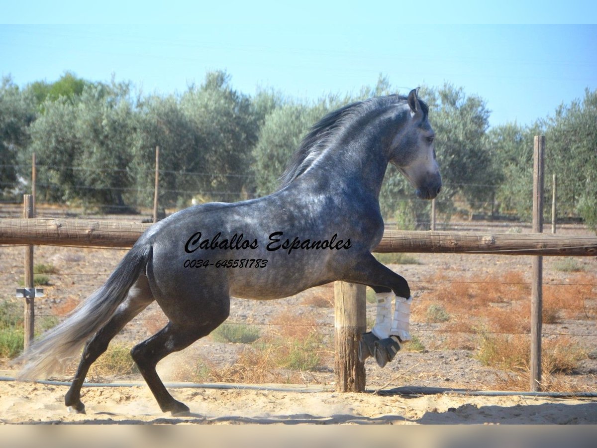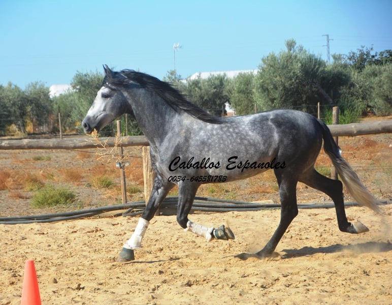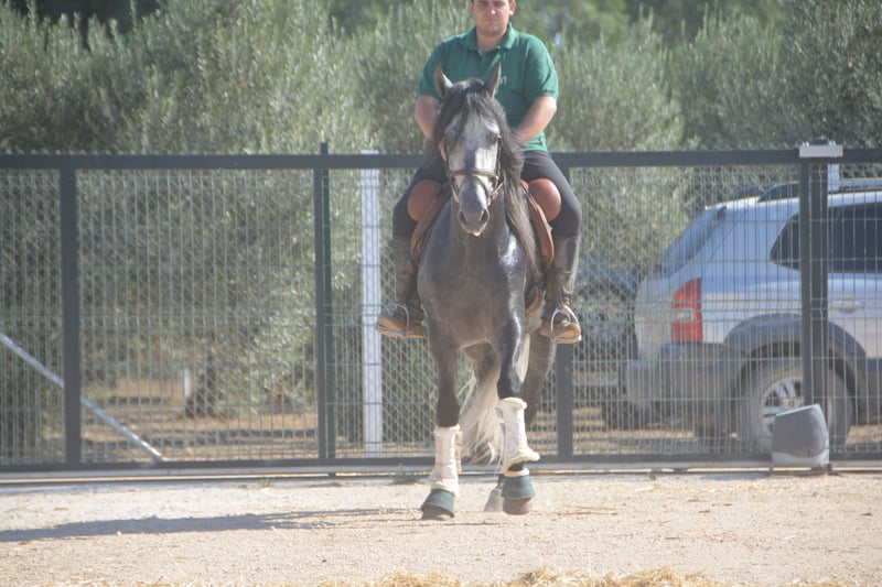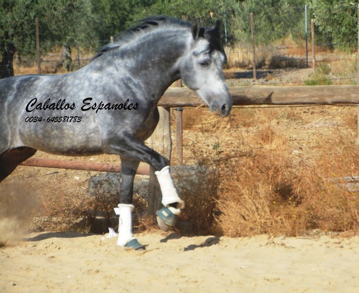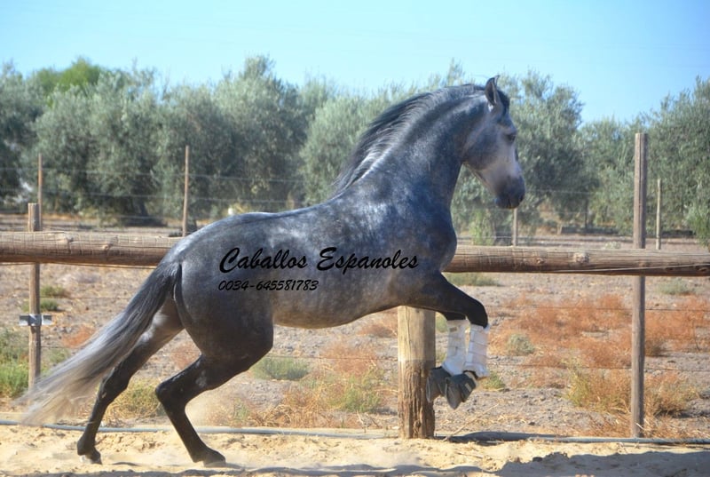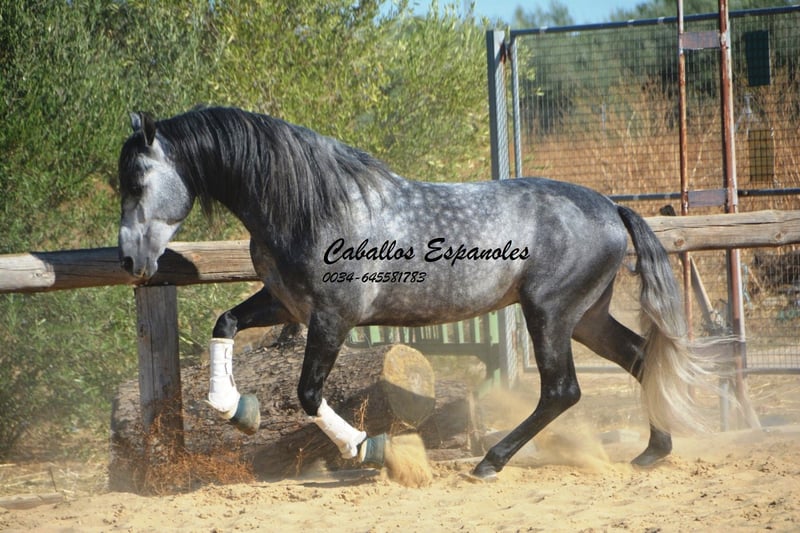Ce magnifique étalon PRE a un style traditionnel. Construit de manière correcte et harmonieuse, avec une conformation baroque, et il n'est pas très grand. L'étalon est monté aux allures de base, et un travail sur les épaules en dedans est en cours. Il a déjà été en extérieur. Il est habitué aux chiens et aux chats et ne s'effraie pas. En manège, il est toujours sage et bien éduqué. Il apprécie beaucoup les caresses. Un partenaire idéal pour le cavalier de loisir. Le cheval est vendu pour le compte du propriétaire. Il peut rester en pension chez nous si souhaité. Une échographie sera organisée rapidement. Transport international possible.