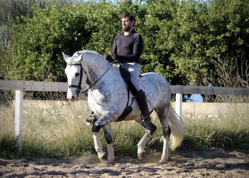 Ein PRE wie aus dem Bilderbuch: der junge Hengst KALAMBRUJO stammt aus der berühmten Zucht Plaza de Armas und überzeugt durch ein besonders barockes Erscheinungsbild. Mit seiner auffälligen Zeichnung und seinem edlen Kopf ist er ein besonders würdiger Vertreter seiner Rasse. KALAMBRUJO ist altersgemäß gut in den GGA geritten, Seitengänge sind angefangen. Er geht zudem sehr gut ins Gelände, alleine wie auch in der Gruppe. KALAMBRUJO ist äußerst sitzbequem und unter dem Reiter sehr brav und zuverlässig. Er besitzt volle Papiere des spanischen Züchtervereins ANCCE und ist frei von Schimmelmelanomen. Standort Spanien.